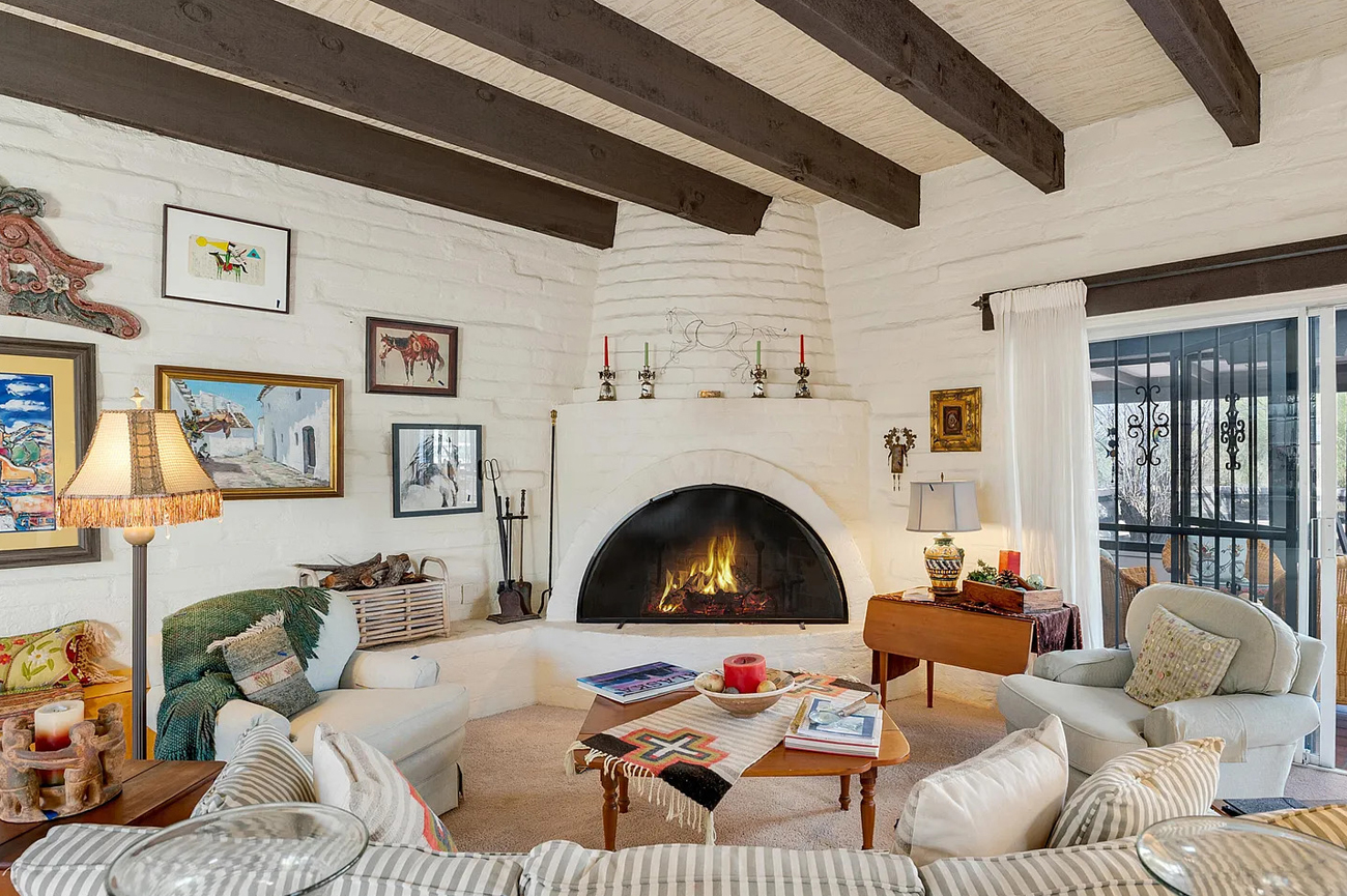 A kiva-style fireplace anchors one end of the space. Its smooth white plaster and rounded shape feel classic and calm. Add a woven rug and wall art, and the space feels welcoming and stylish all at once.
