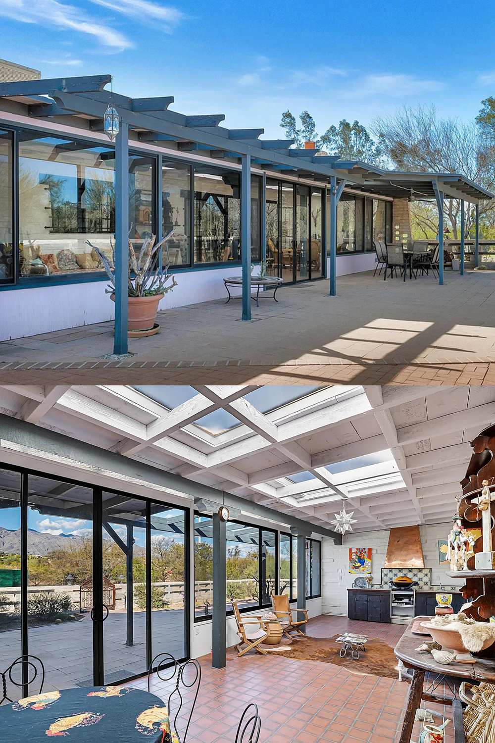 This home connects inside and outside with ease. Large windows and glass doors open wide to patios and gardens. Covered walkways guide you from room to room. Sunrooms and verandas stay cool and bright with terracotta tile floors.