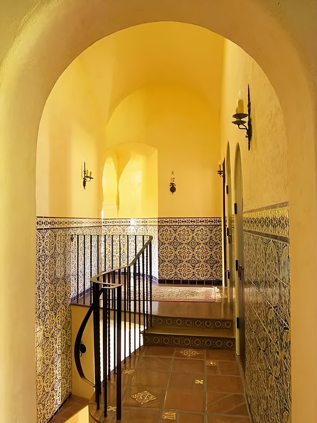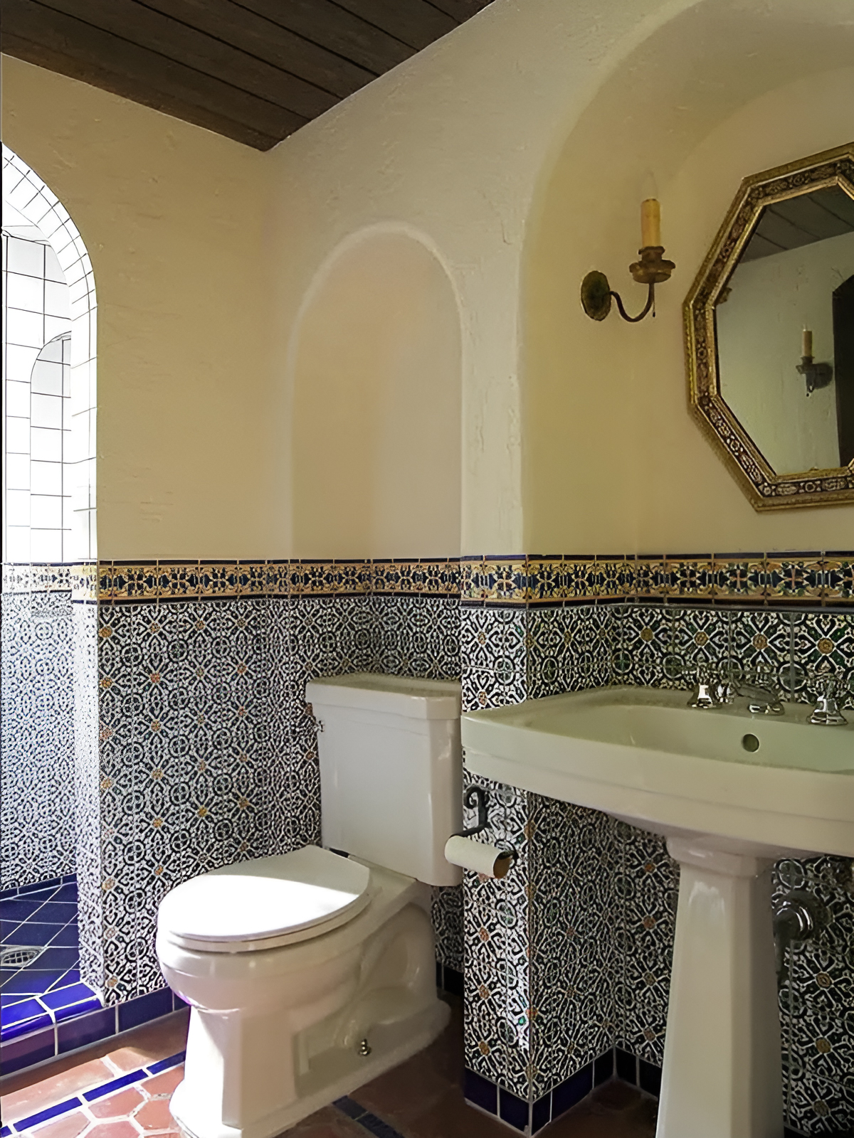 Even the bathrooms feel special. Geometric tile wraps the lower walls in rich pattern. Arched niches add charm and function.