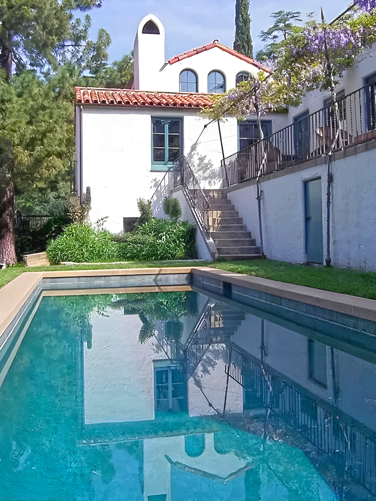 Paths of grass lead you through the yard. They guide you to quiet corners and garden beds. A raised terrace overlooks the pool. It’s the perfect spot to rest or nap in the afternoon breeze.