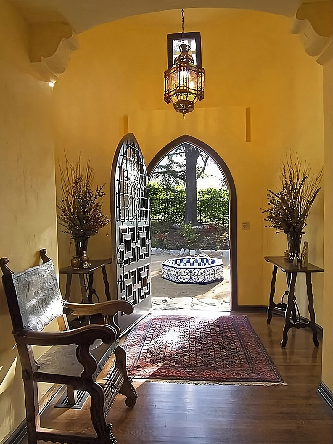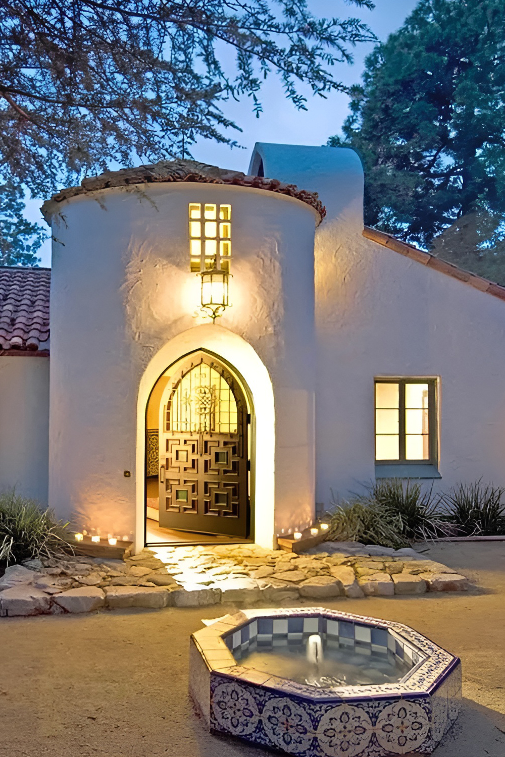 The front door steals the show. Solid wood feels strong and timeless. Iron details add character and charm. The Moorish arch hints at the beauty waiting inside. Just beyond the door, a hand‑painted tile fountain greets you. The soft sound of water brings instant calm. It feels peaceful the moment you arrive.