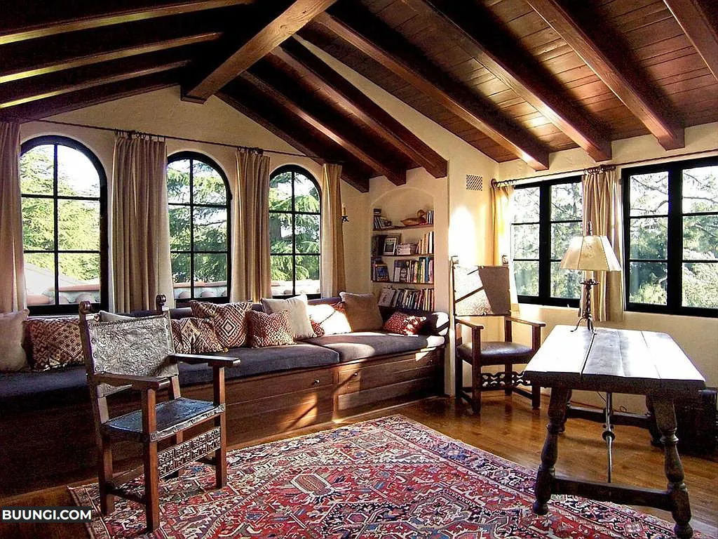 Large windows fill the space with light. Some are arched. Others are straight. All frame peaceful garden views. Dark wood trim and iron curtain rods add contrast and drama.