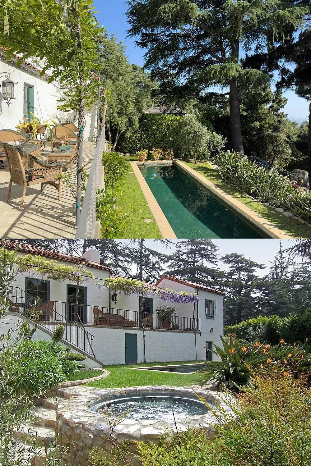 The long, narrow pool feels calm and elegant. It’s great for cooling off or swimming laps. Nearby, a stone hot tub sits low and natural. It blends right into the garden.