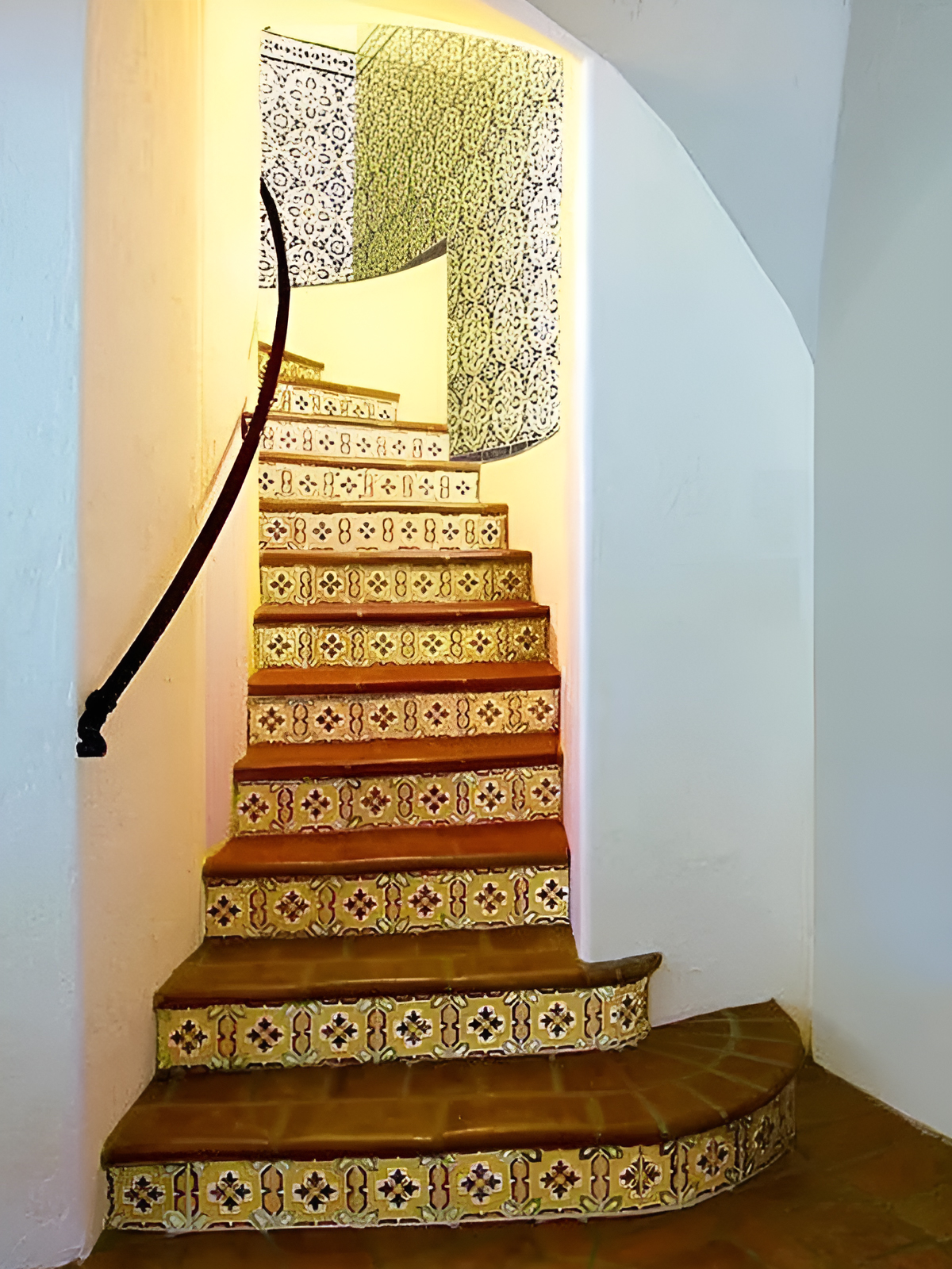Inside, the staircase catches your eye right away. Each step features hand‑painted tiles in sunny yellow and soft blue. The iron railing curves gently and feels organic.