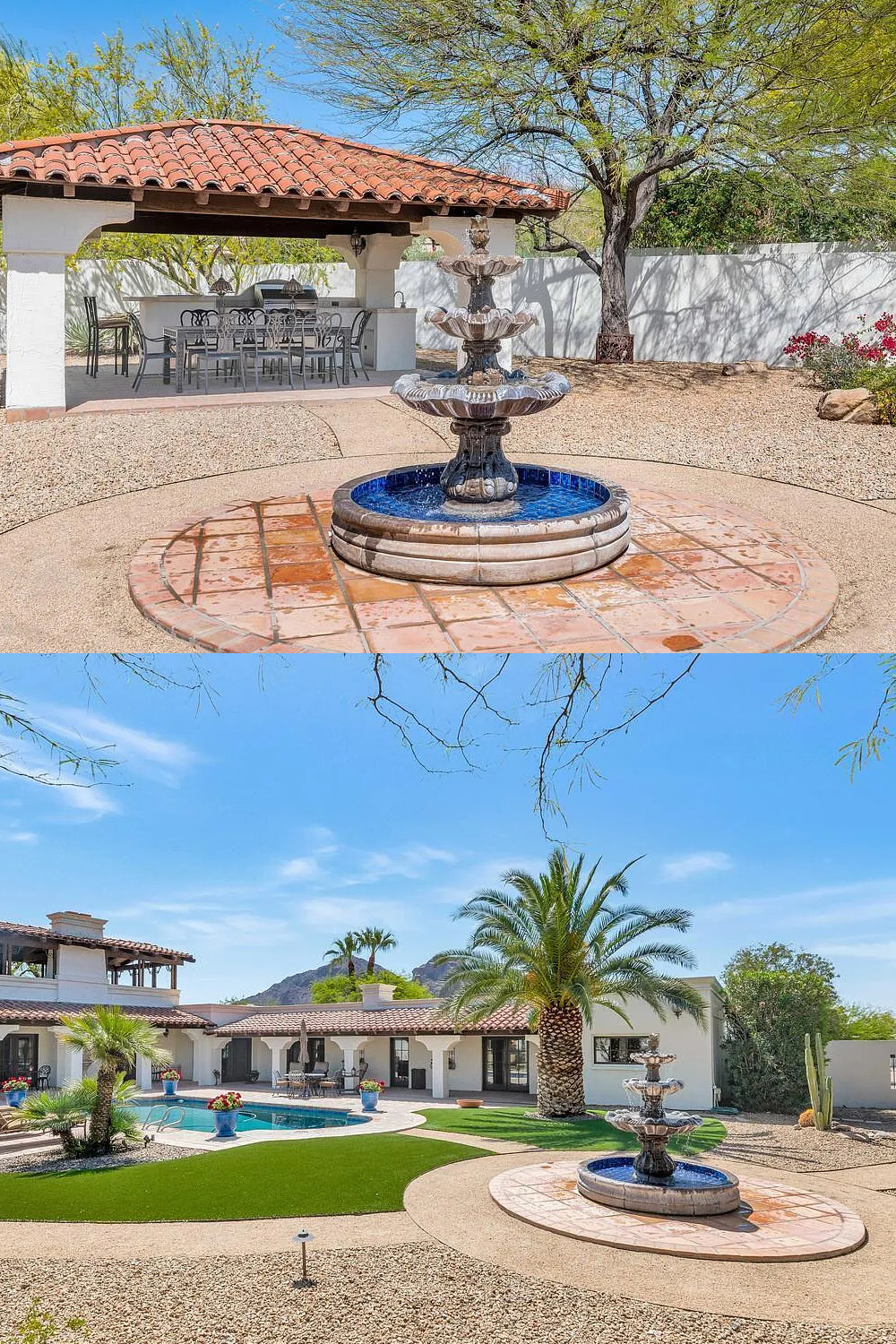 No Spanish courtyard is complete without a fountain. This home features a beautiful, three-tiered showpiece. Water bubbles and splashes over blue-tiled bowls. The soothing sound calms your mind and fills the yard with peace.