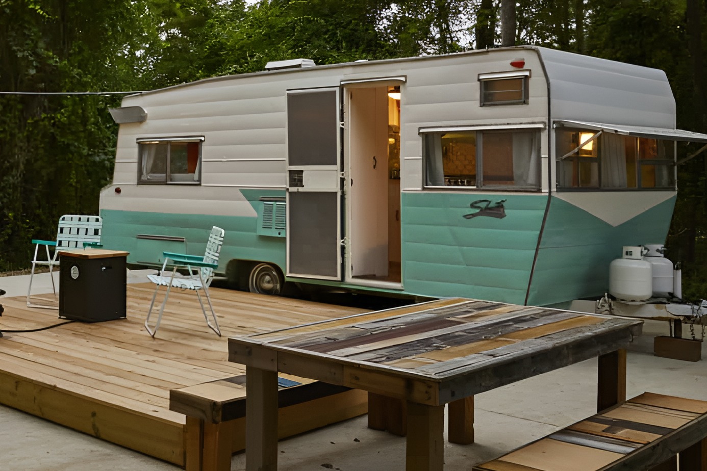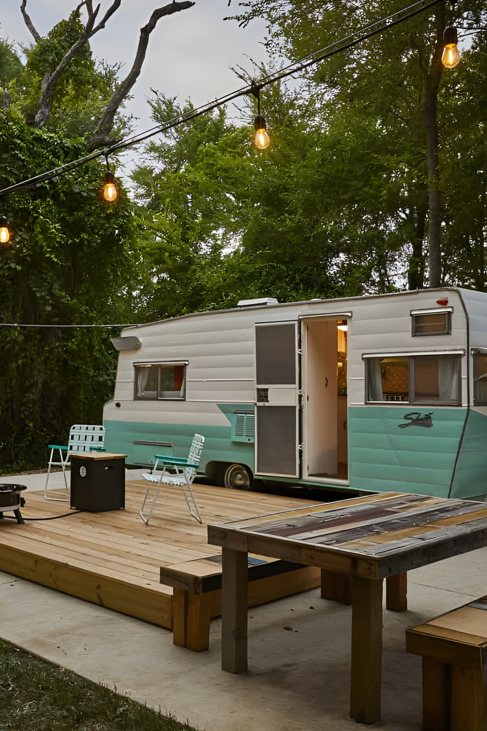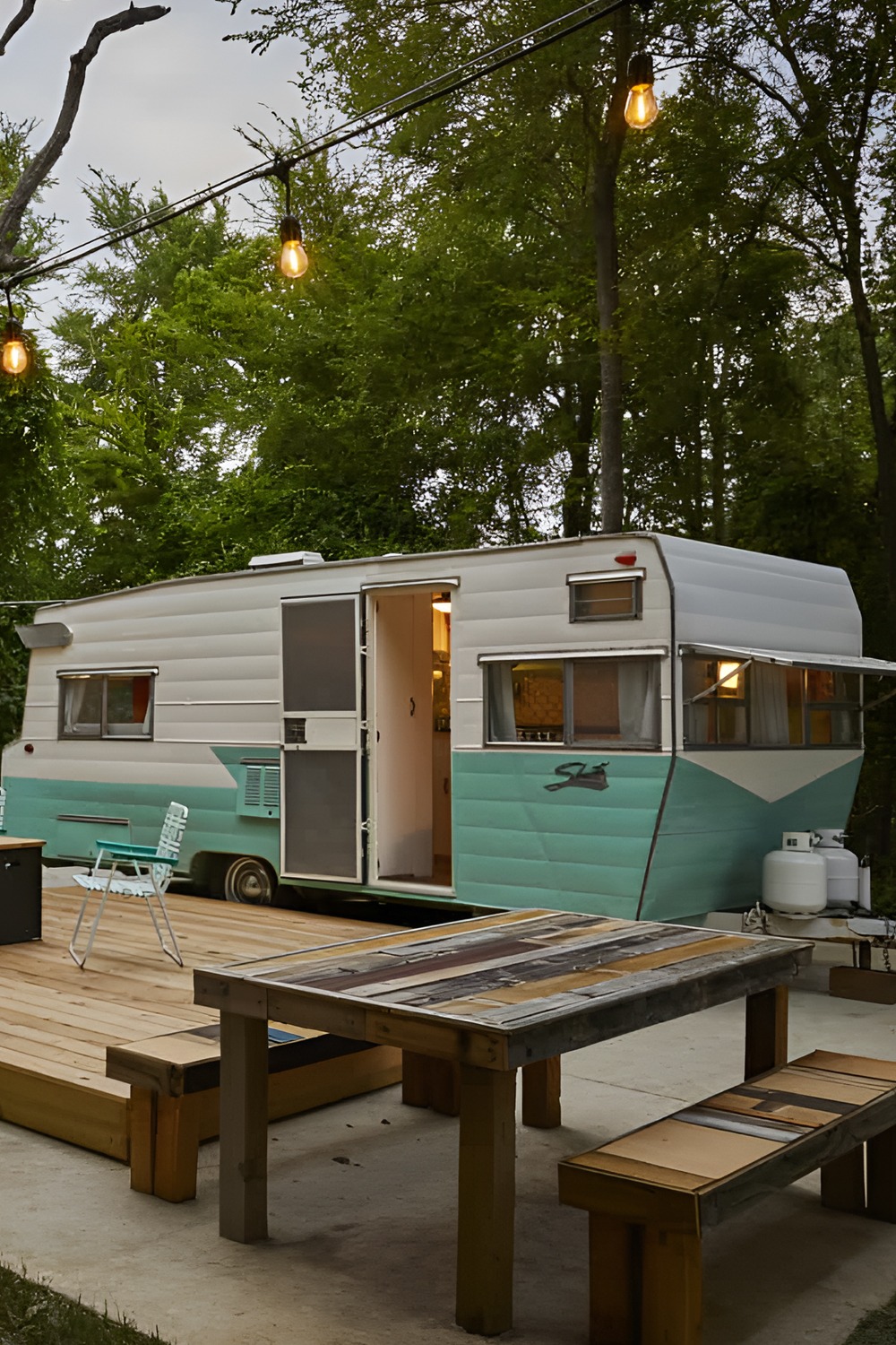 Imagine pulling off the road at golden hour. String lights glow between tall trees. A mint-and-white camper waits on a wooden deck. The door stands open. Inside, every inch feels warm, bright, and loved. This vintage camper trailer proves that small spaces can feel big on charm—and huge on comfort.