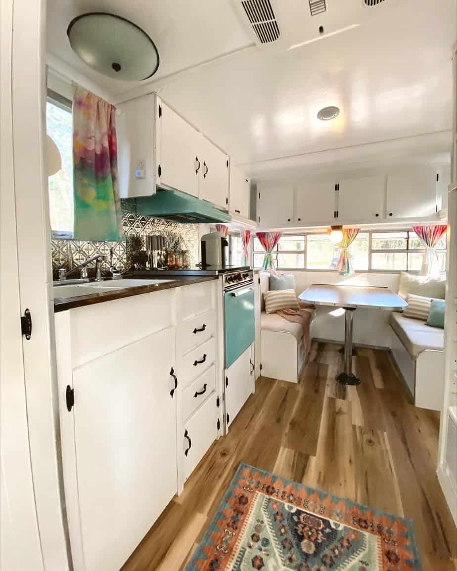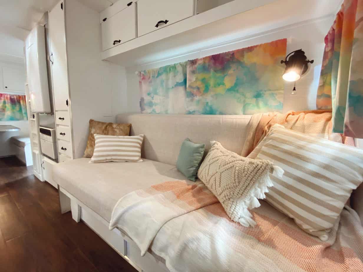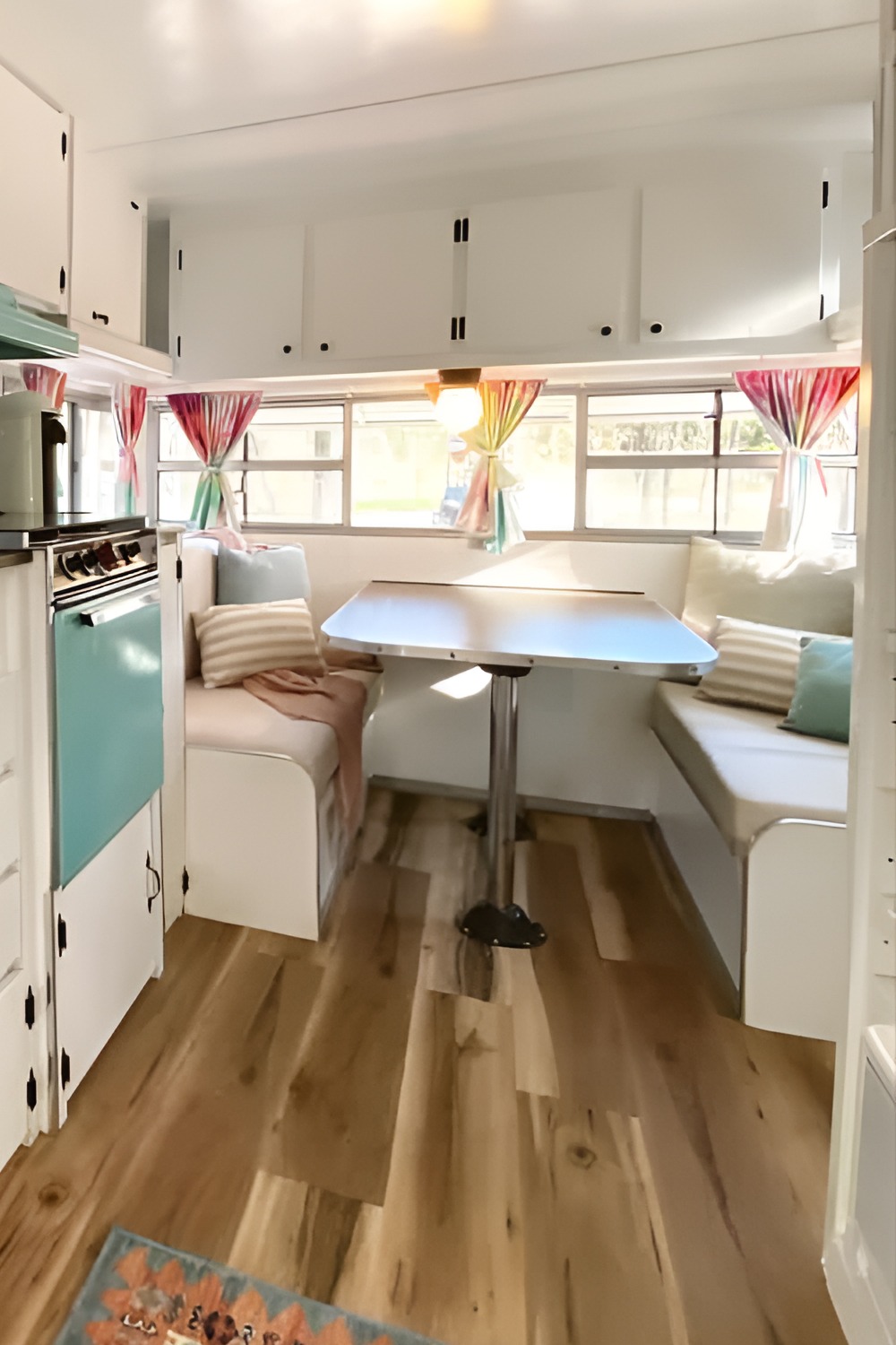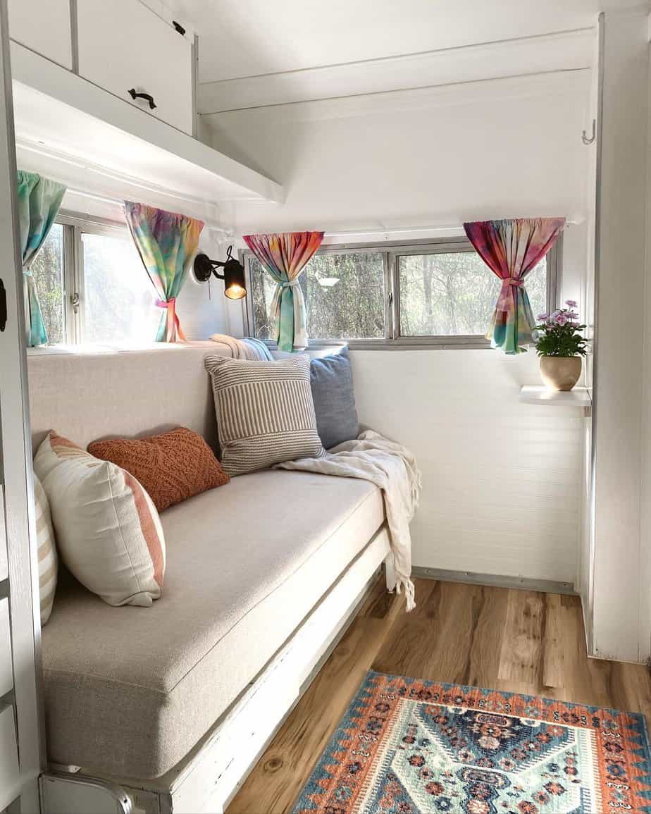 White cabinets above the seating blend into the walls. They do not feel heavy or bulky. This keeps the camper feeling open.