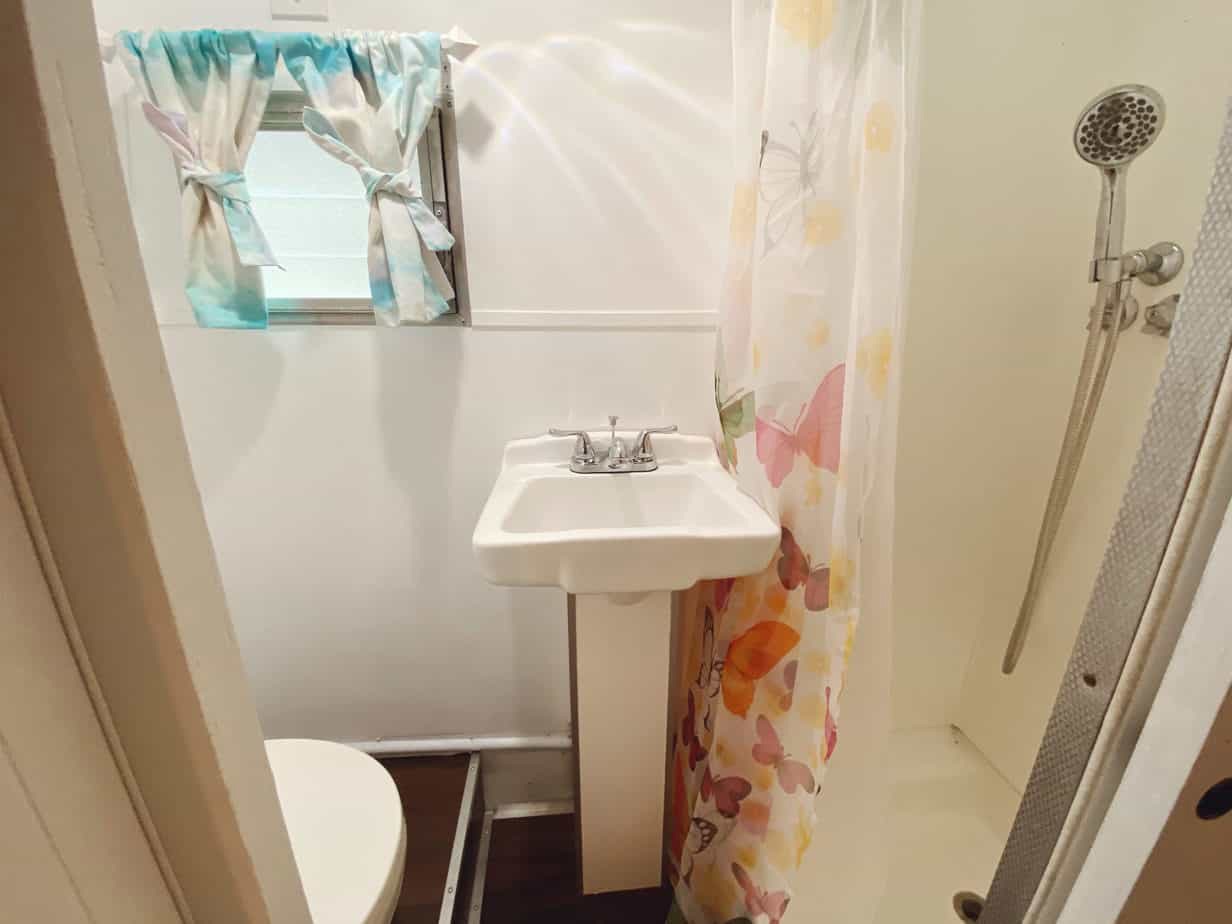 The sink and shower stay bright white. This keeps the tiny room feeling clean and open.