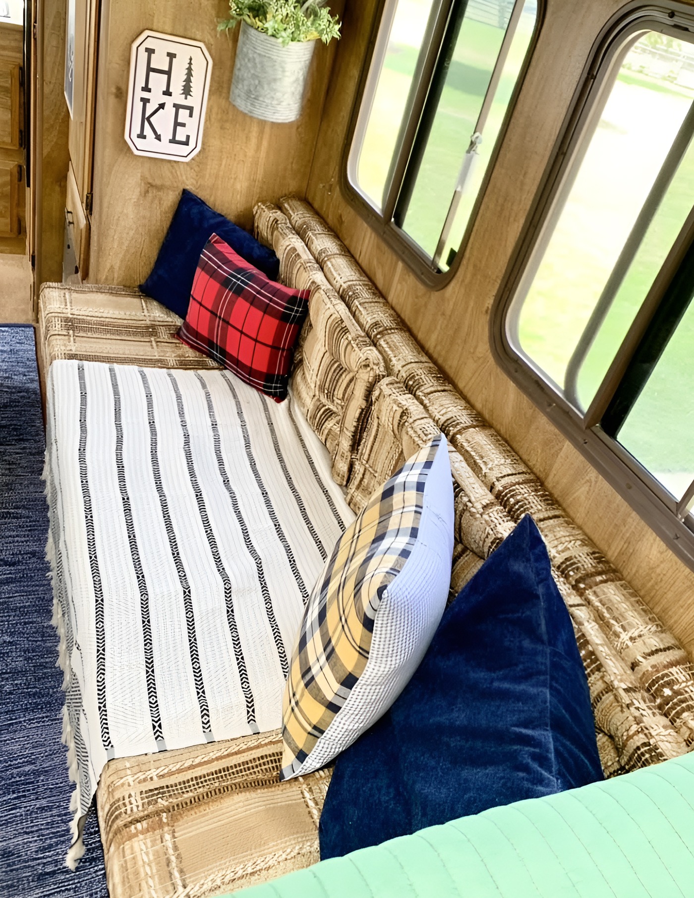 The sofa keeps its original shape and built-in function, which is a smart choice. In small spaces, custom built-ins usually work harder than replacement furniture. The updated styling helps it feel fresh. A striped cover softens the seat and hides some of the older upholstery. Then the pillows bring in personality. The plaid and solid navy pillows create contrast and make the seating look intentional rather than improvised.