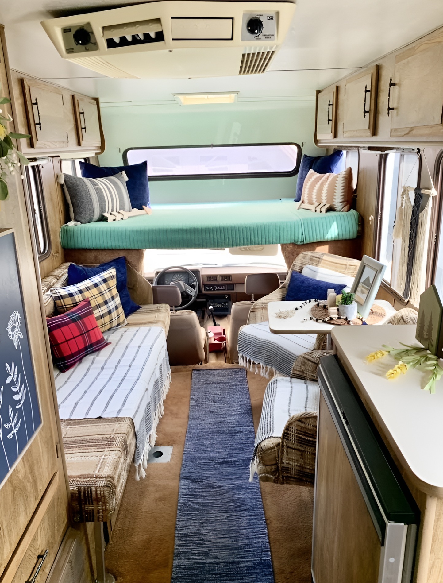 Even better, the bed adds color to the center of the motorhome. In many vintage RVs, the top bunk can look dark or forgotten. Here, it feels happy and intentional. It lifts the whole room.