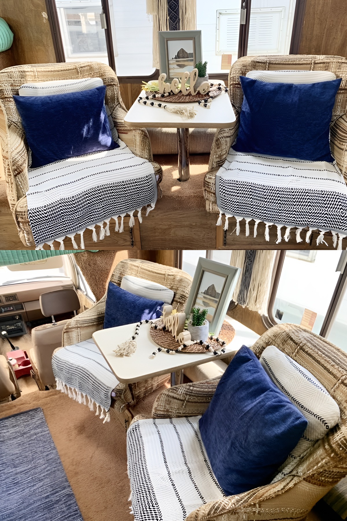 The two lounge chairs do a lot for the room. They make the motorhome feel less like a vehicle and more like a true living space. Their rounded shape softens the interior lines, and their placement around the table adds a casual conversation area. Again, the throws and pillows matter. They turn older chairs into cozy design features.