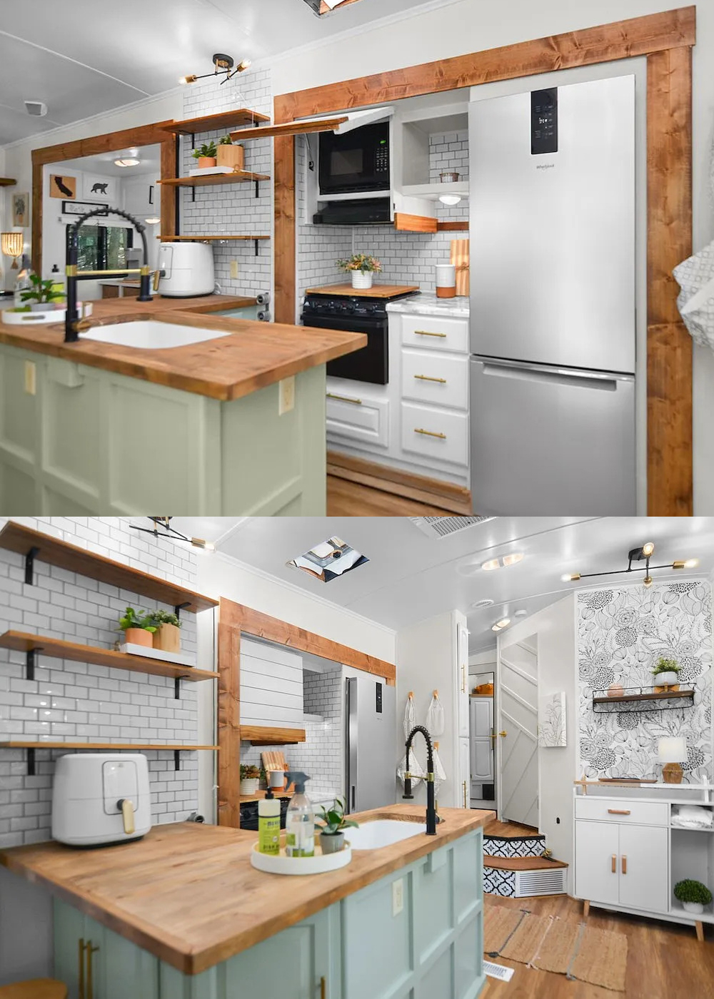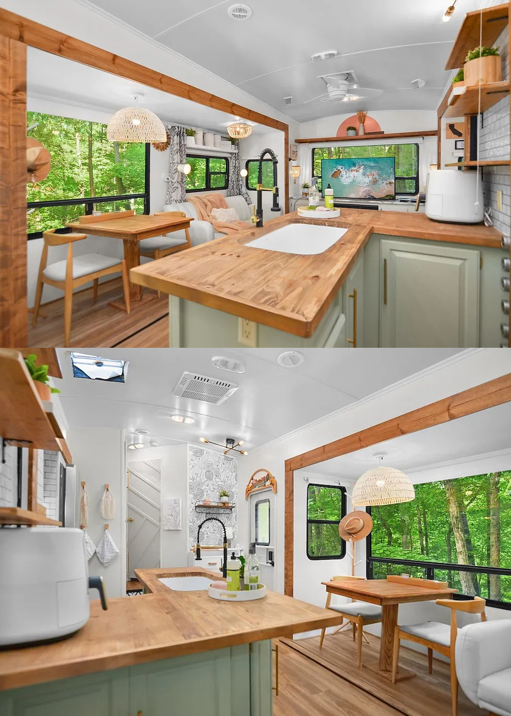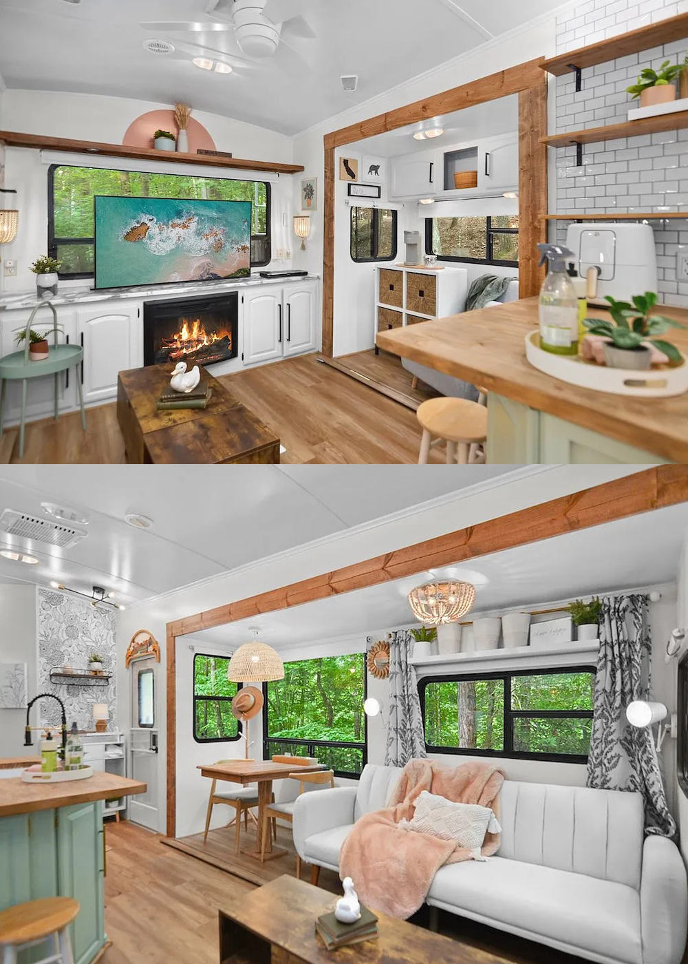 What makes this camper remodel stand out is its consistent style. It balances farmhouse charm with modern touches.