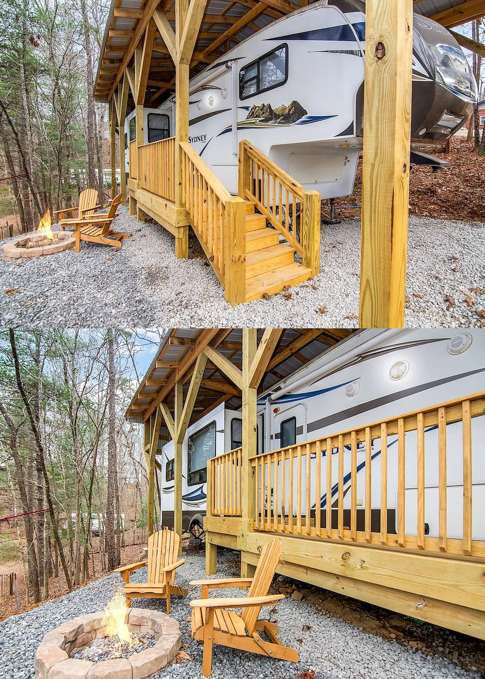A wooden deck with a railing creates a clear and safe entry. The natural wood blends beautifully with the forest setting. Right beside it, a round stone fire pit and Adirondack chairs make the perfect spot to gather at night. Picture yourself roasting marshmallows as the fire glows and the camper lights shine behind you.