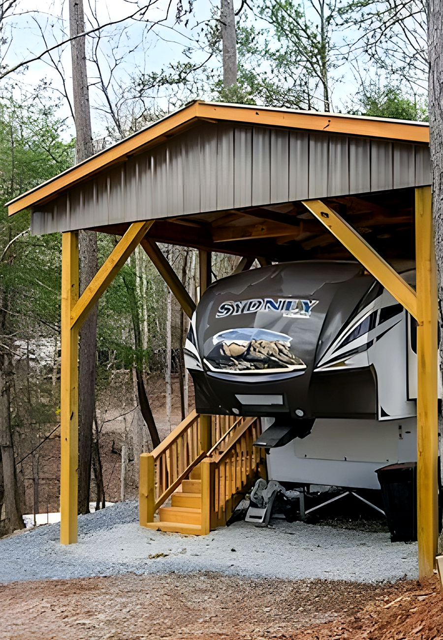 The outside sets the stage for what’s inside. A strong wooden pavilion covers the camper, giving it shade and shelter from the weather. It makes the outdoor space just as useful as the interior.