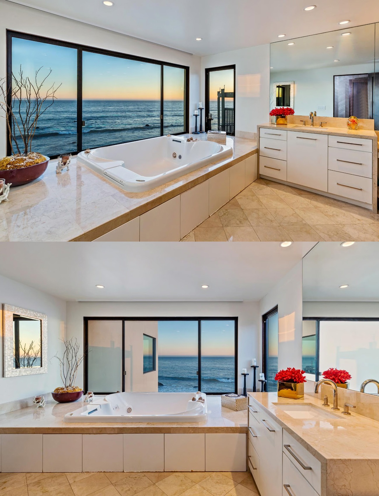 The palette stays very light here. Creamy stone floors, pale counters, white cabinetry, and a large mirror all help the room feel fresh and open. That light look works beautifully with the ocean outside. Nothing competes with the water. The finishes simply reflect it.