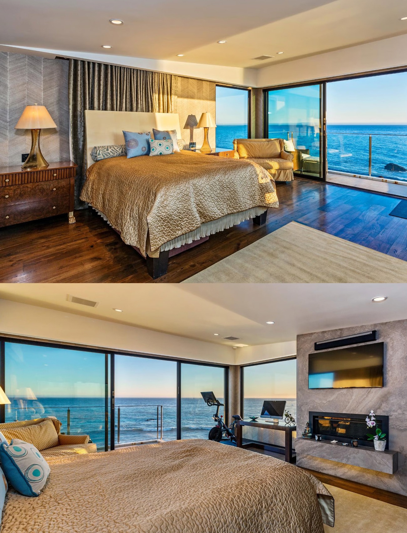 Bedroom cues to notice: a tall upholstered headboard, sandy bedding, blue accent pillows, a fireplace media wall, layered seating, dark floors, soft area rugs, and full-height glass facing the water.