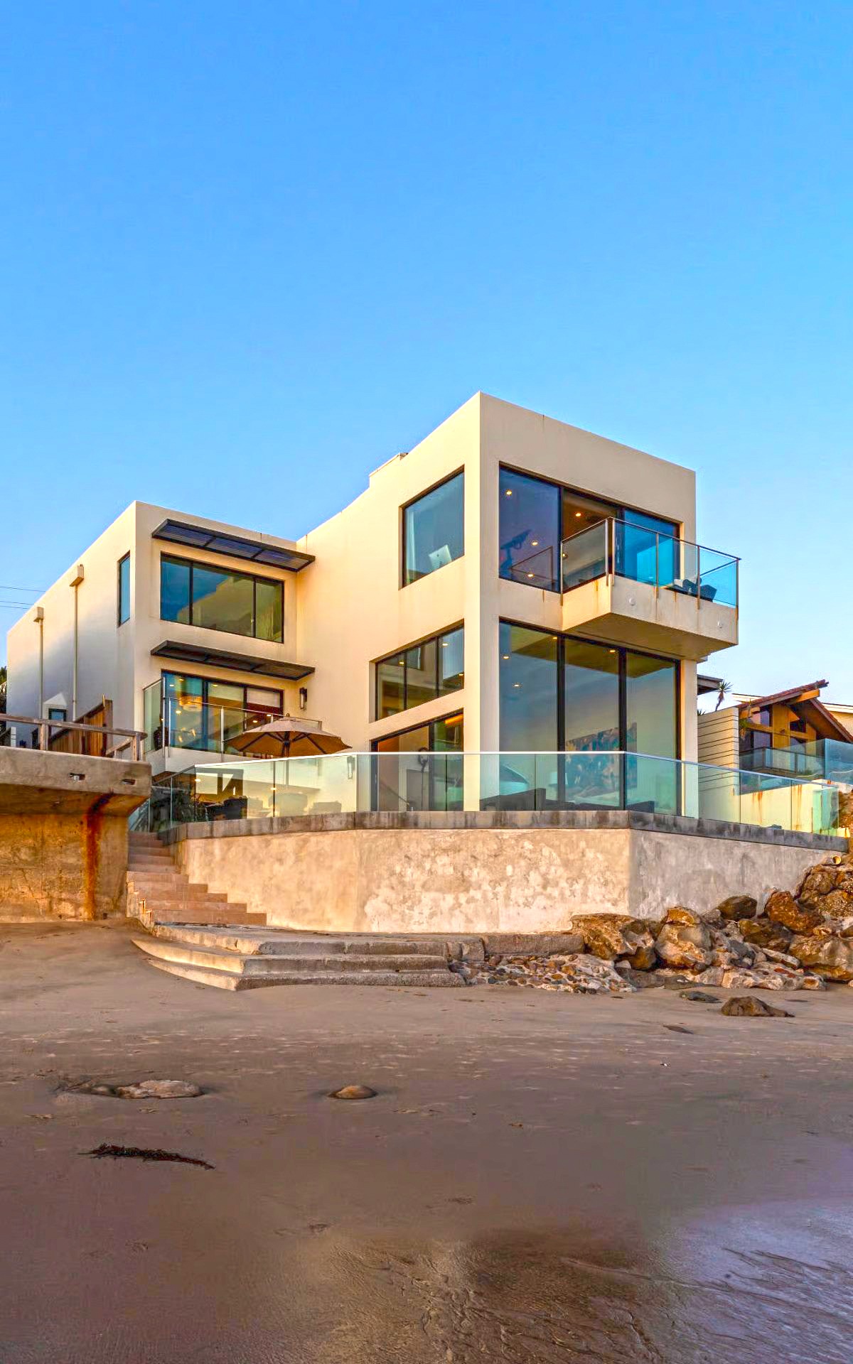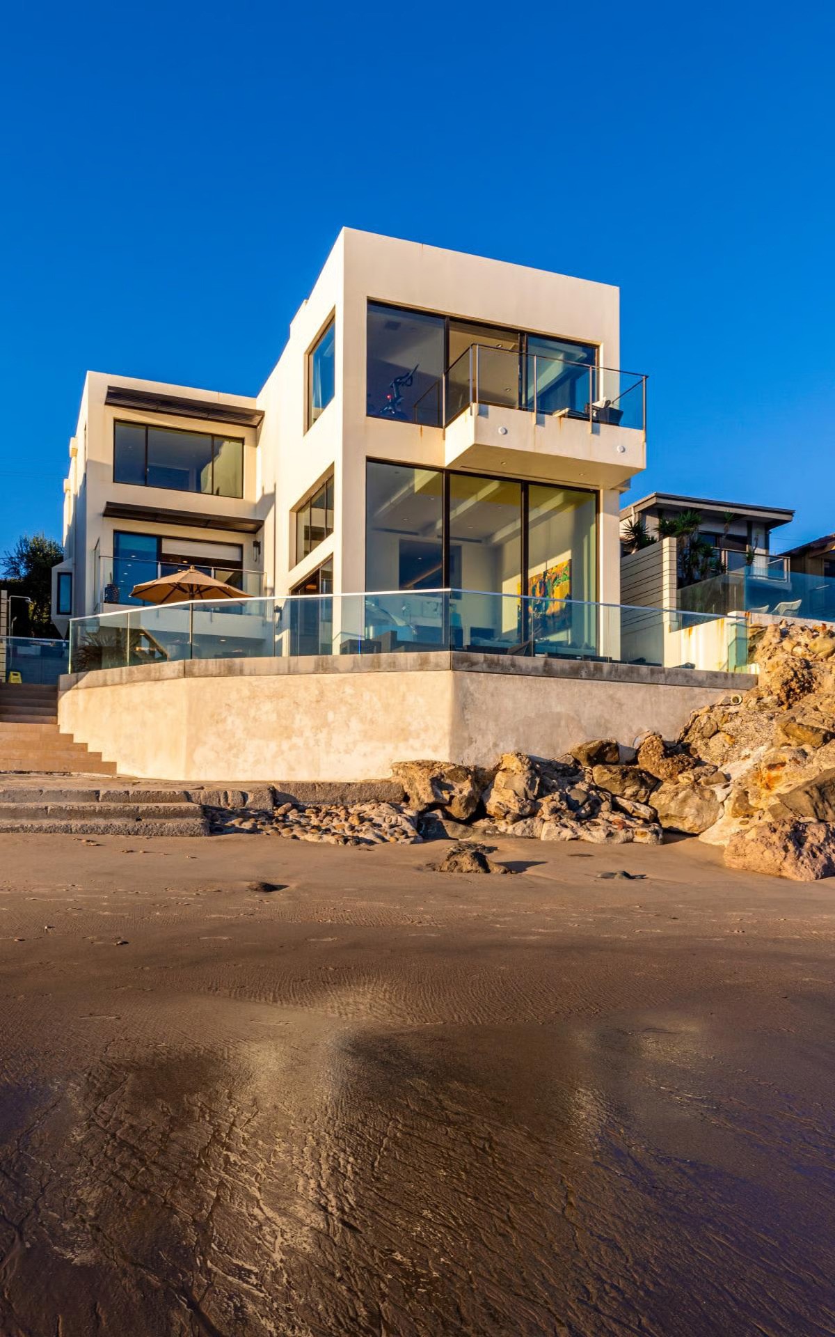 From the beach, this house makes a strong first impression. The structure looks crisp and geometric, with stacked rectangular forms, flat planes, and sharp corners. That modern shape gives the home a confident look. At the same time, the creamy exterior color softens the mass and helps it glow in the sunlight.