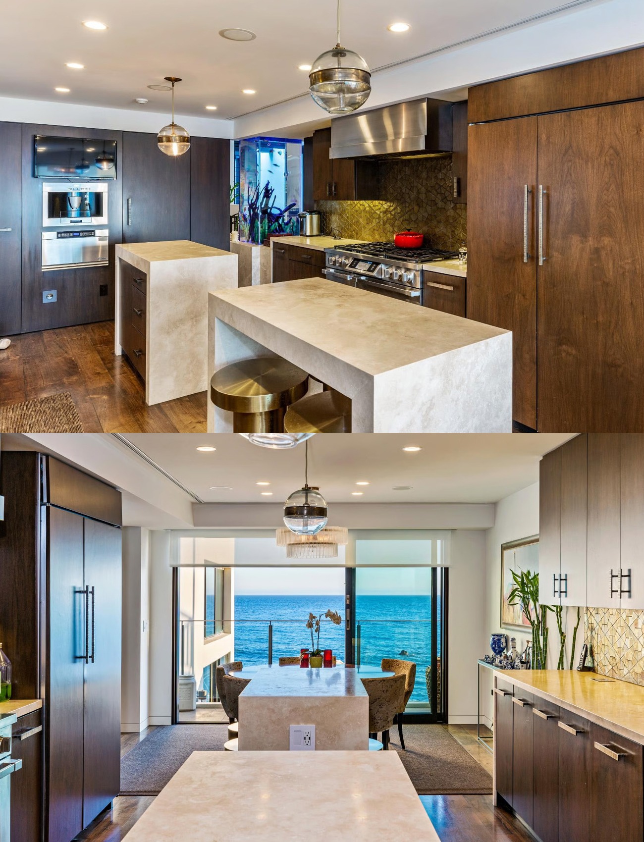 Kitchen cues to notice: flat-panel walnut-style cabinetry, creamy stone islands, globe pendants, a bold stainless hood, textured backsplash, built-in appliances, and a feature aquarium.