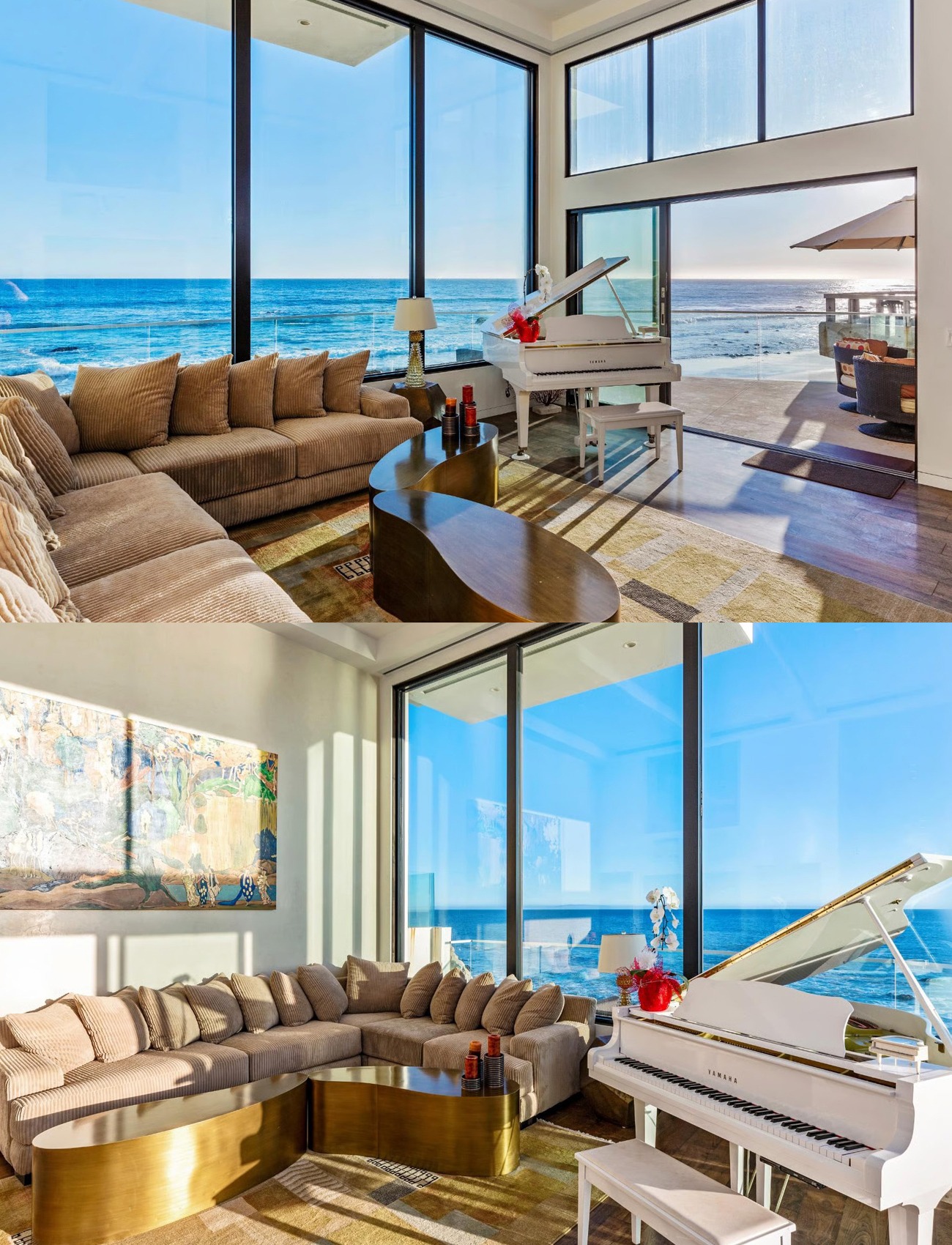 Still, this room does not feel stark. The design team warmed it up with rich wood floors, a soft patterned rug, and a large sectional in a muted taupe tone. That sofa choice feels smart. It is plush, relaxed, and deep enough for real lounging. It also keeps the palette calm, which lets the sea outside add the boldest color in the room.