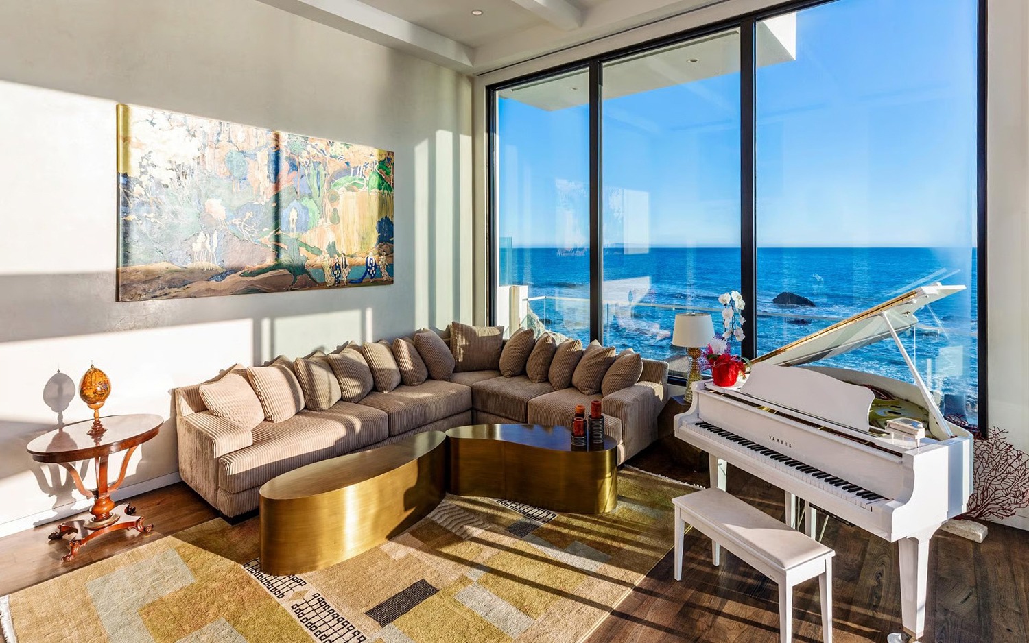Art stays simple here, and that is a good choice. The room already has a strong focal point in the water view. Too much wall decor would compete with it. Instead, the room uses one major art piece, a few decorative accents, and the piano to keep the styling polished.