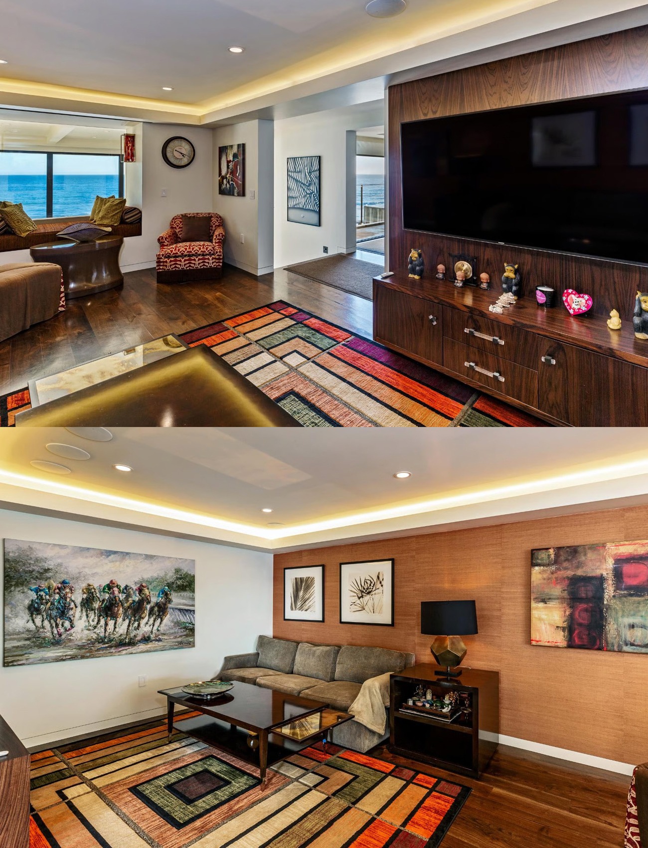Media lounge cues to notice: dark wood media wall, layered lighting, strong area rug, mixed art, deep seating, and a layout built for comfort.