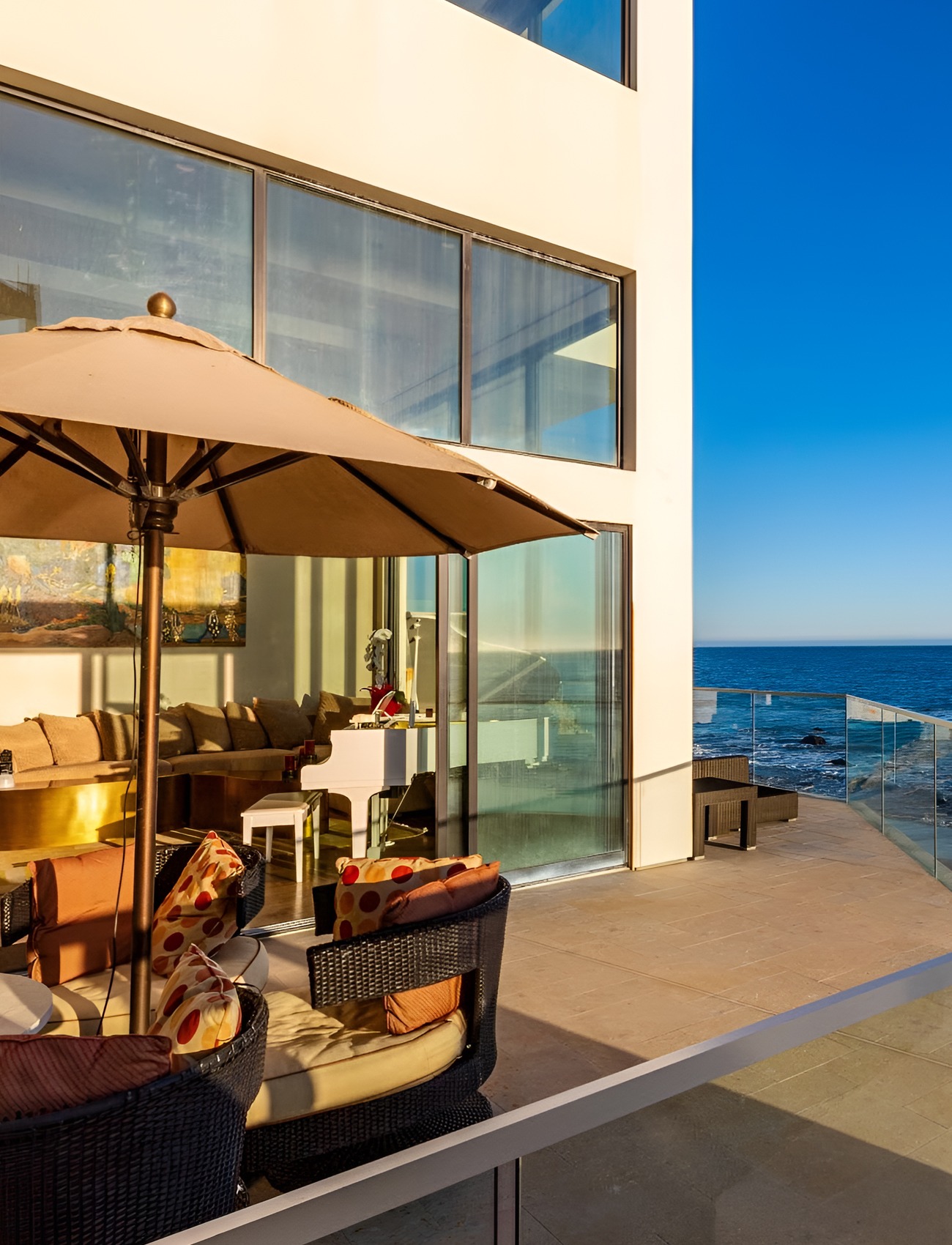 The glass balcony railings matter just as much. They protect the views instead of blocking them. That choice feels smart and very coastal. When a home sits this close to the water, solid railings would only cut off the experience. Here, the glass lets the horizon stay wide and open.