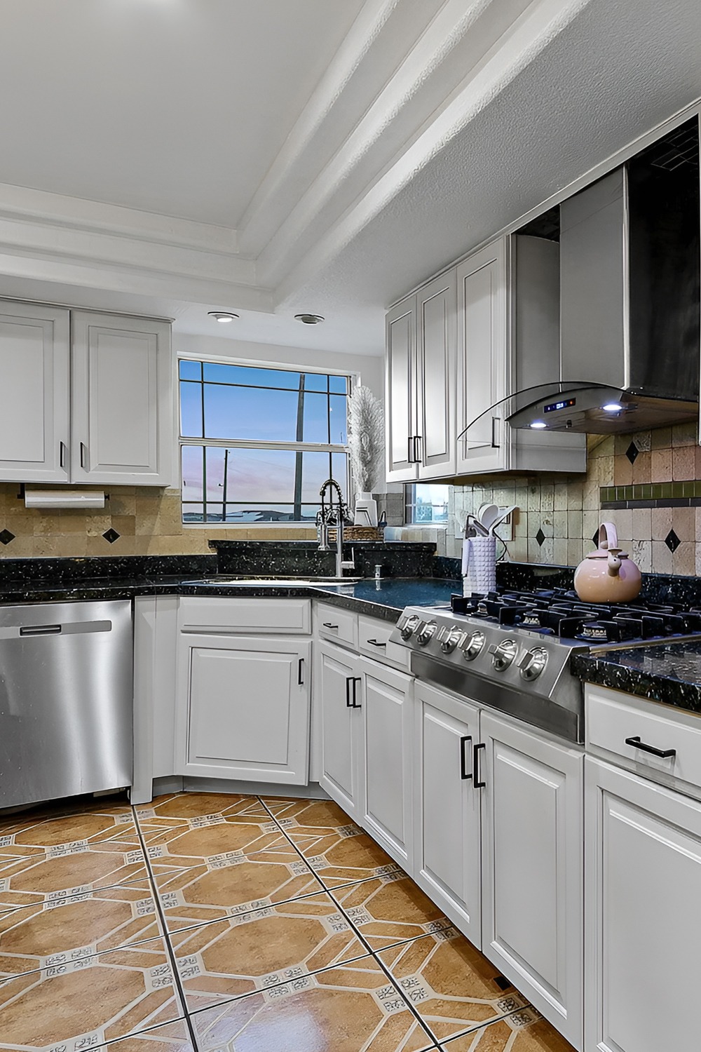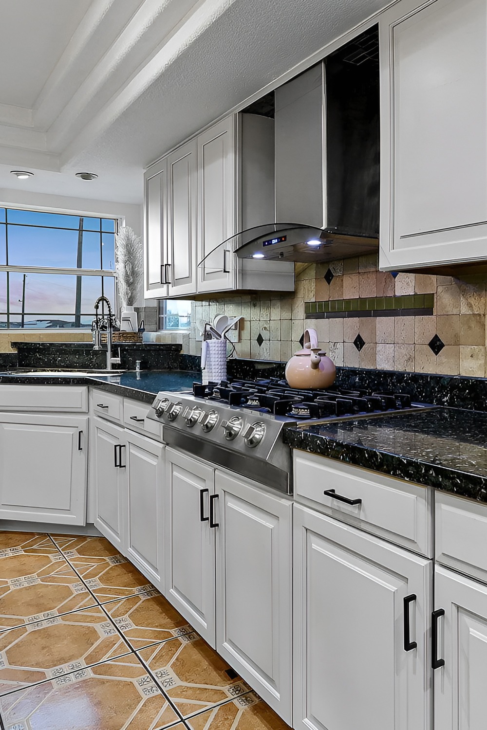 The backsplash is where old meets new. Here, you see square stone tiles in soft tan shades. Little black diamonds add just enough detail to keep things interesting.