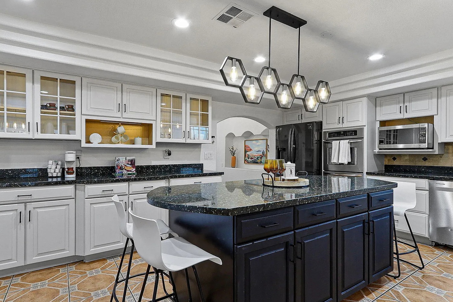 The colors in a modern hacienda kitchen are easy on the eyes. Start with bright whites for cabinets and walls. Add deep black or dark brown for islands and hardware. Bring in warm tones—like sand, gold, or terracotta—for your floors and backsplash.