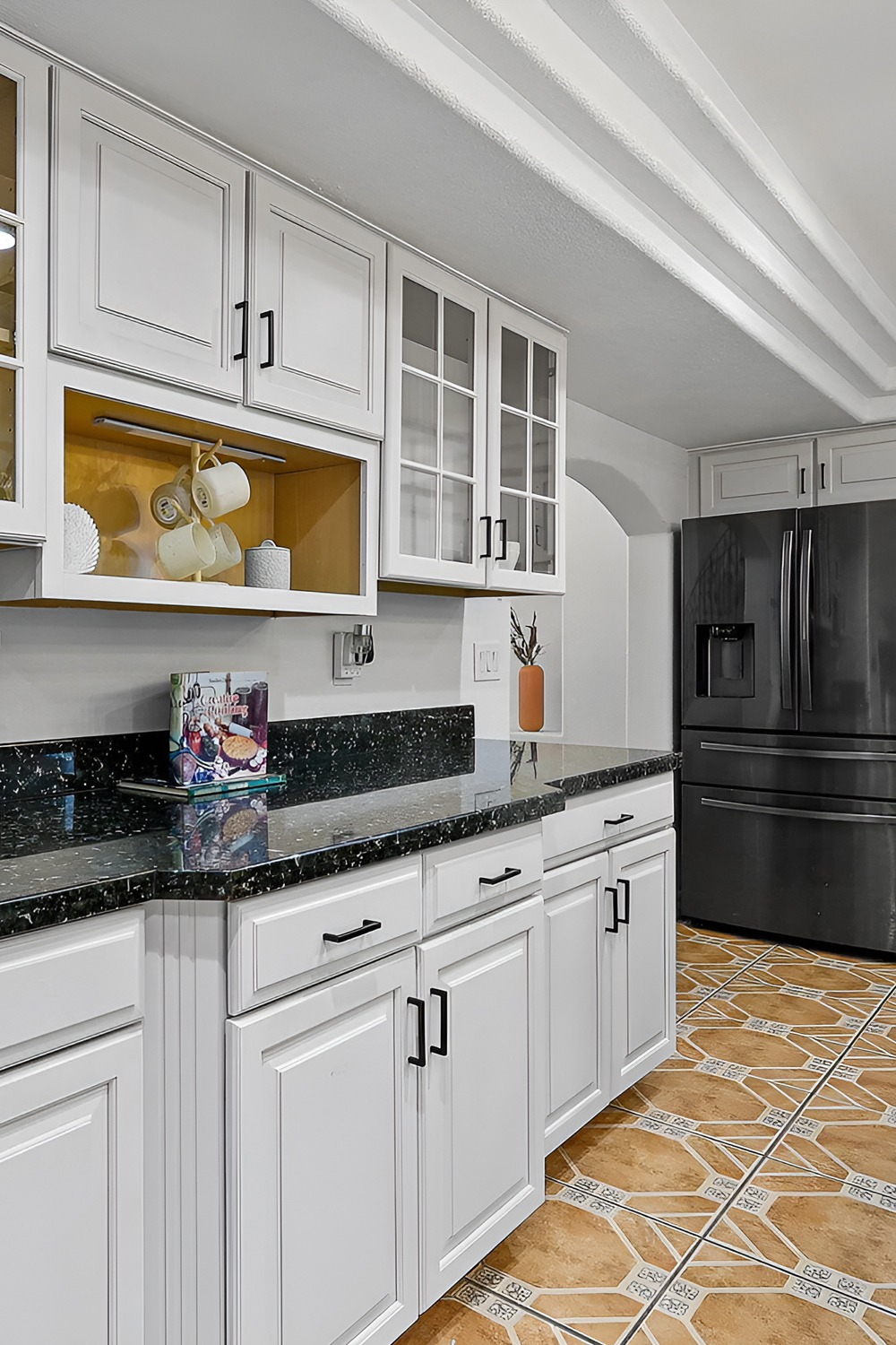 Next, notice the countertops. Modern hacienda kitchens often use dark stone. In these photos, the deep black granite countertops shine with specks of silver and gray. They remind you of river rocks and starlit nights.