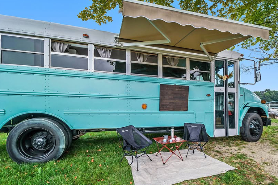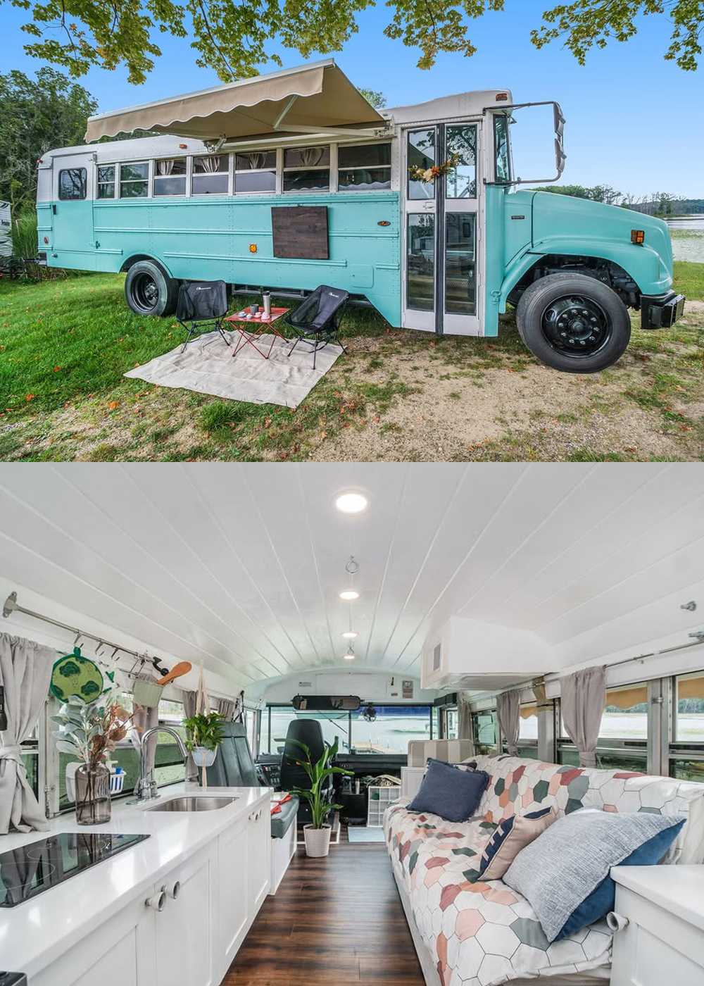 Don’t forget the outside! The bus’s classic retro body is painted in a soothing minty teal with a creamy white roof, giving it major curb appeal. There’s a big awning for shade and a cozy outdoor rug with chairs for sipping coffee or stargazing. It’s an instant outdoor living room, perfect for relaxing at the campsite or enjoying a sunny afternoon by the lake.