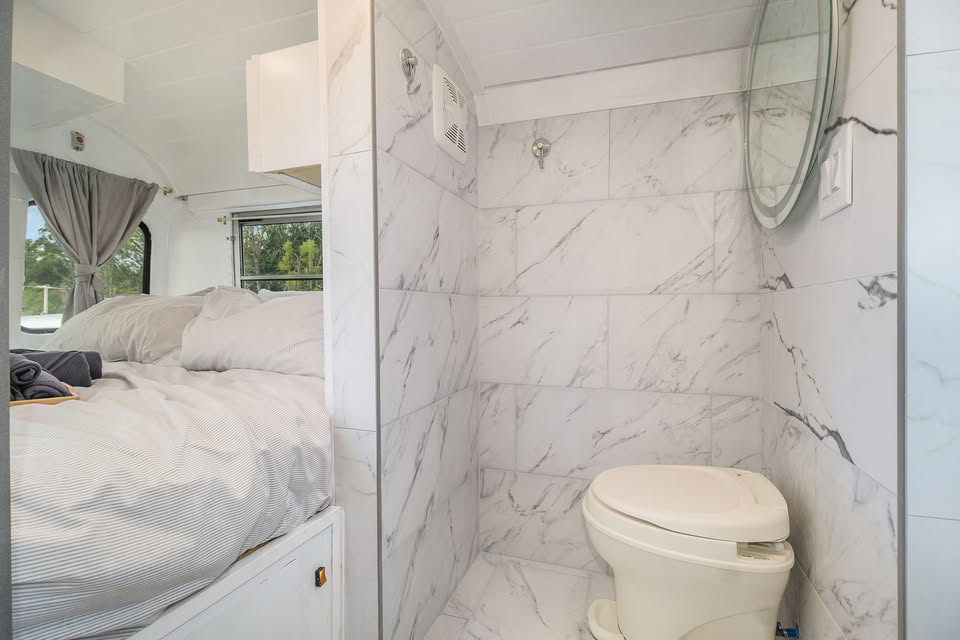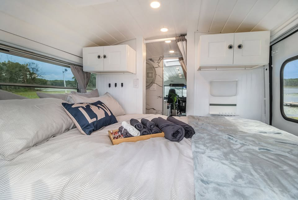 In the back of the bus, you’ll find a bedroom that feels like a cloud. The bed is full-sized and loaded with soft pillows and a cozy comforter in gentle gray stripes. There’s a tray with rolled towels and treats for a boutique hotel feel.