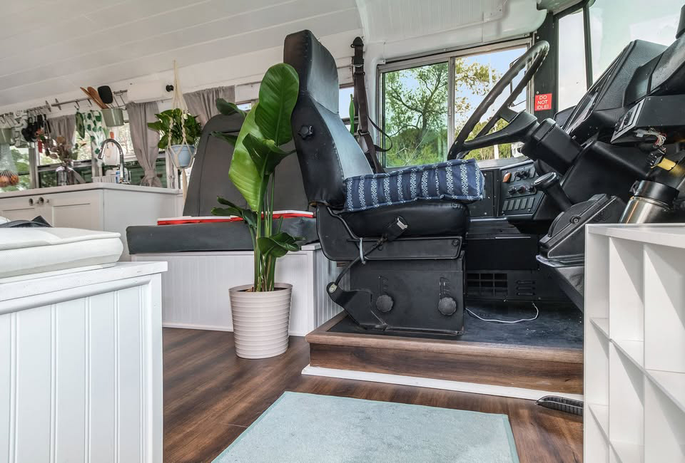 At the front, the bus driver’s seat remains—but now it’s part of the style story. A blue patterned cushion adds comfort, while a potted plant brings life to the entry. The step up to the cab is finished to match the rest of the flooring, and the whole area feels like a natural extension of the home, not just a cockpit.