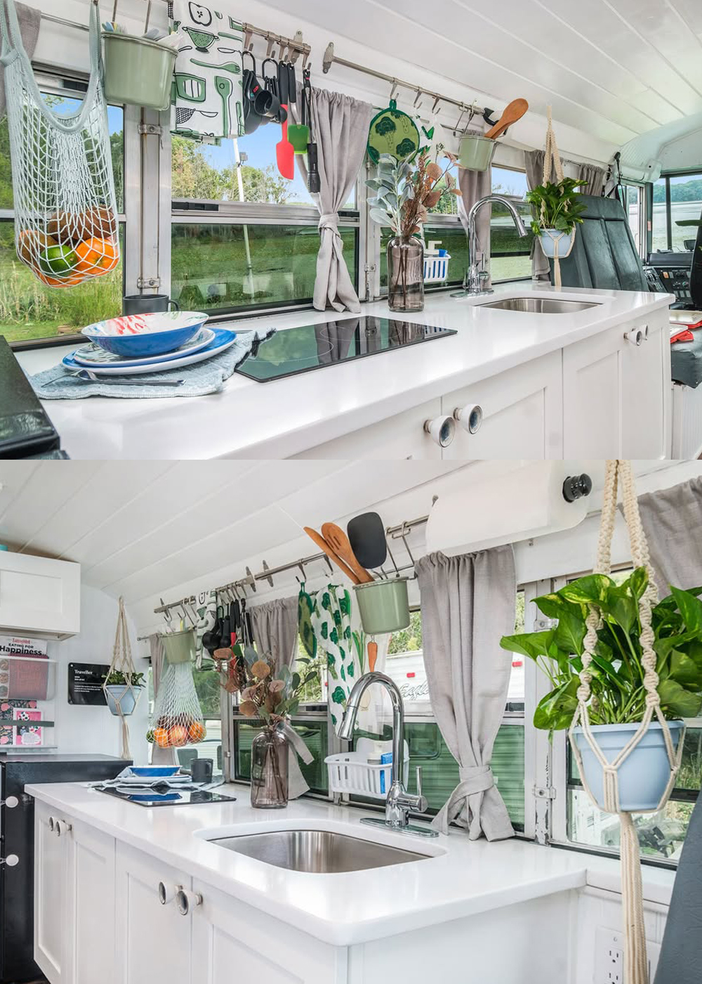 Hooks and hanging organizers keep things tidy and easy to find. Baskets and bins add more storage without cluttering up the space. Even the area near the driver’s seat features a live plant and a handy spot to stash shoes or bags.