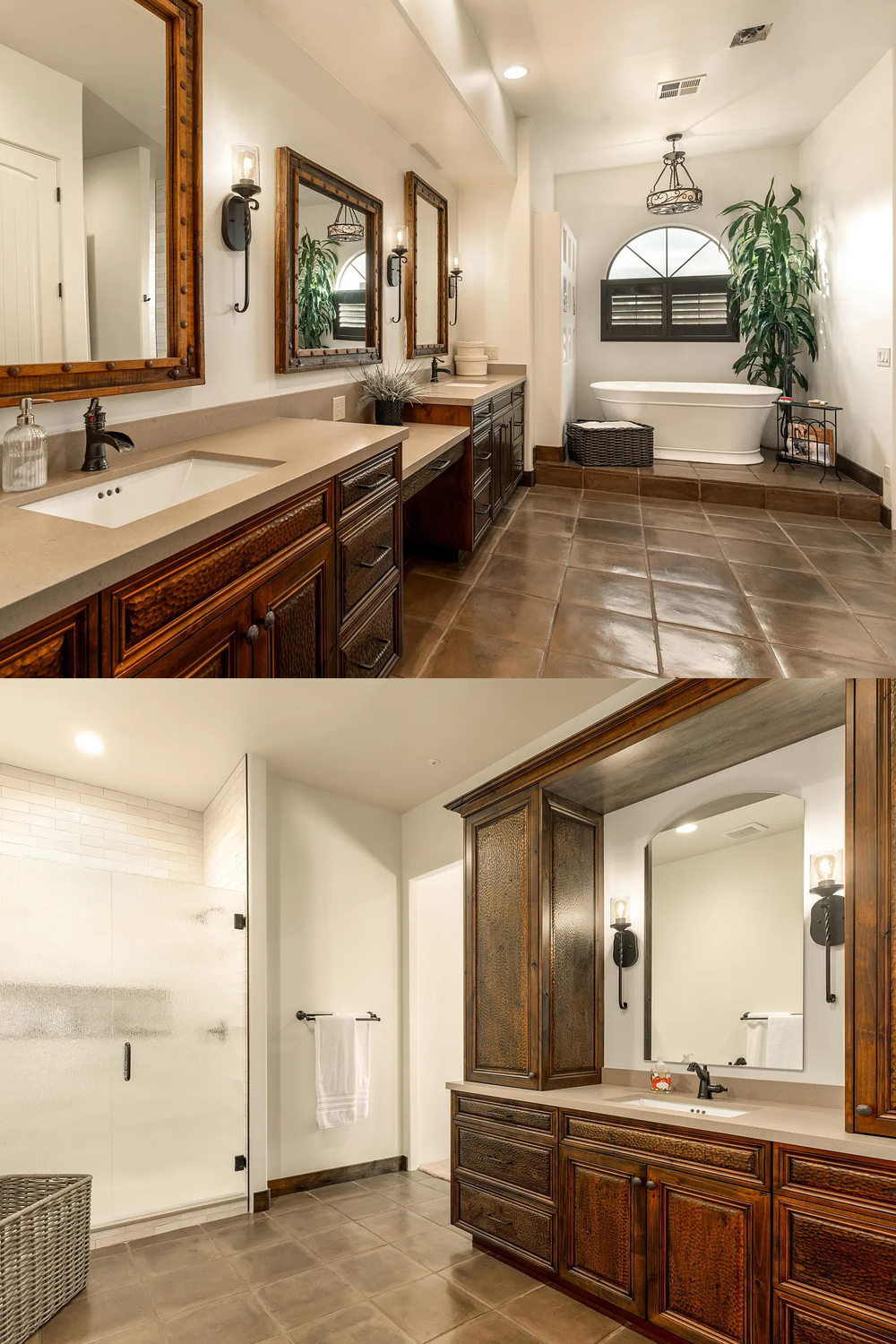 Soft beige counters keep the room neutral and soothing. Iron sconces sit on each side of the mirror and add warm light. They have a classic wrought-iron look that fits the Spanish style so well.