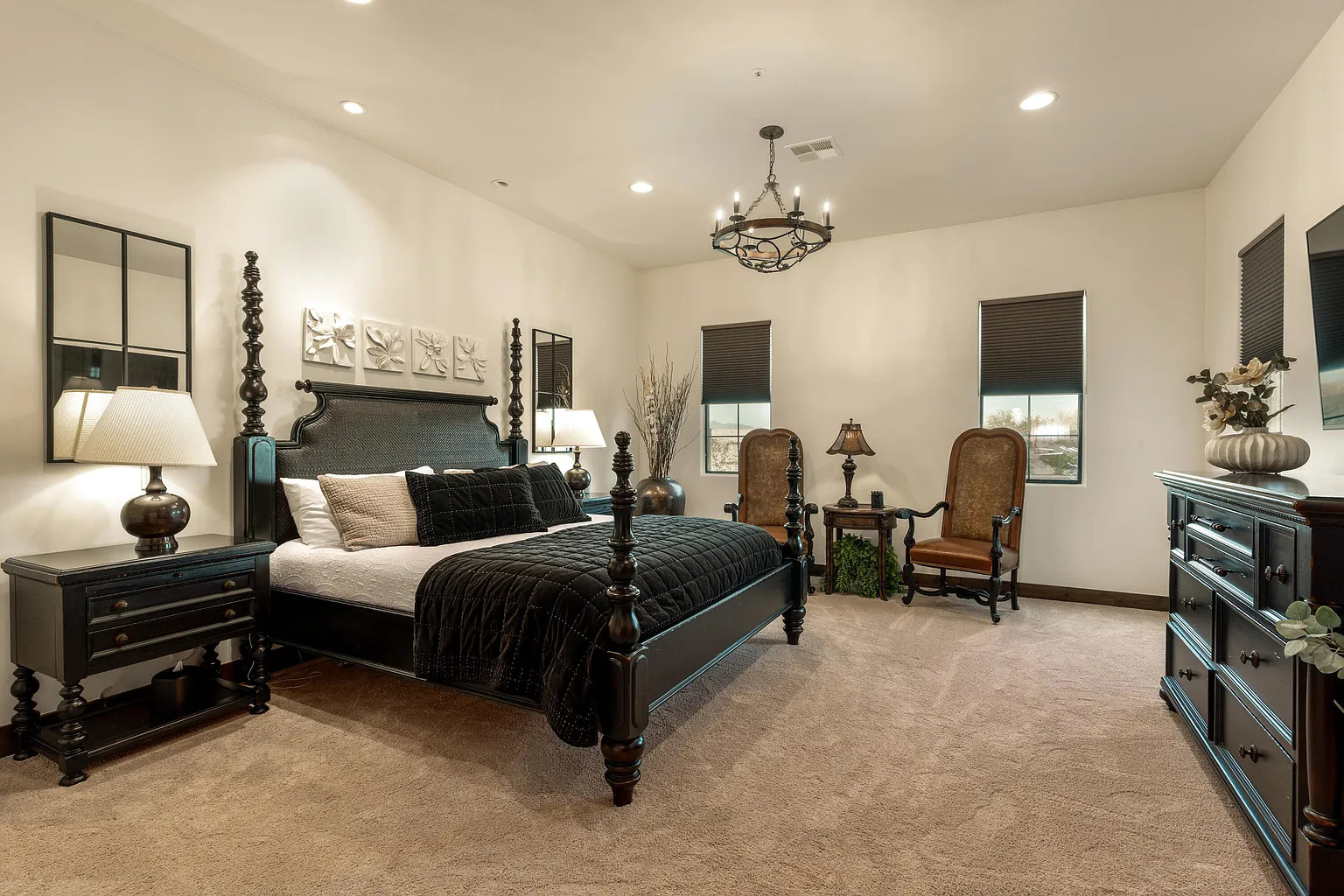 Warm lamps glow softly across the room. Their golden light bounces off the black furniture and keeps the space from feeling too dark. Plush carpet covers the floor, so the room feels soft and warm from the moment you step inside.