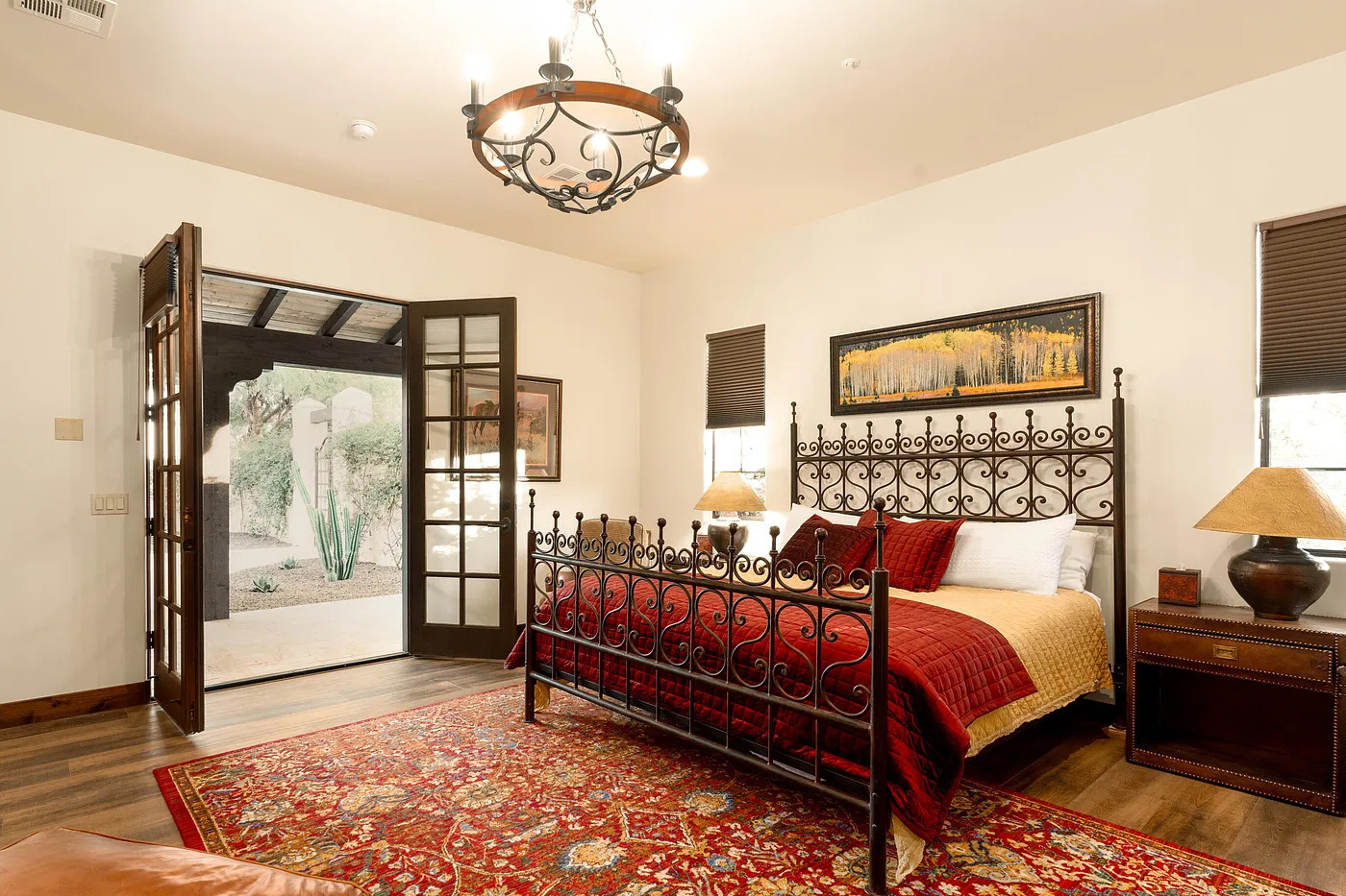 The wrought-iron bed steals the show. Its scrollwork has a classic Spanish look. Warm colors fill the room, from the deep red bedding to the large patterned rug underfoot. The mix of gold, red, and brown creates a cozy palette that feels both rich and soothing.