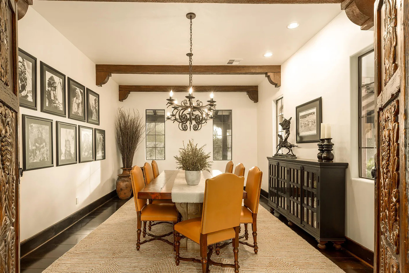 The ceiling beams continue the Spanish look. A classic chandelier hangs in the center and adds soft light. The carved wooden chairs sit on a plush rug, inviting you to sink in and relax. A console lines the wall opposite the fireplace and adds storage, warmth, and visual balance.