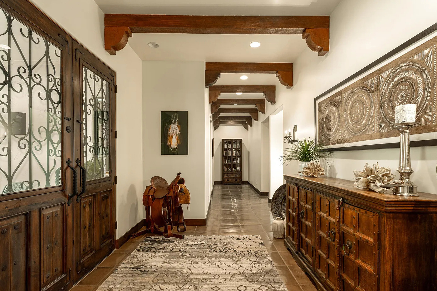 The hallway shows off carved wooden corbels under each beam. Their curved shapes add a subtle touch of artistry. The long console on the right adds rich color and texture with its paneled details. Soft decor pieces and silver candlesticks sit on top, adding a graceful look.