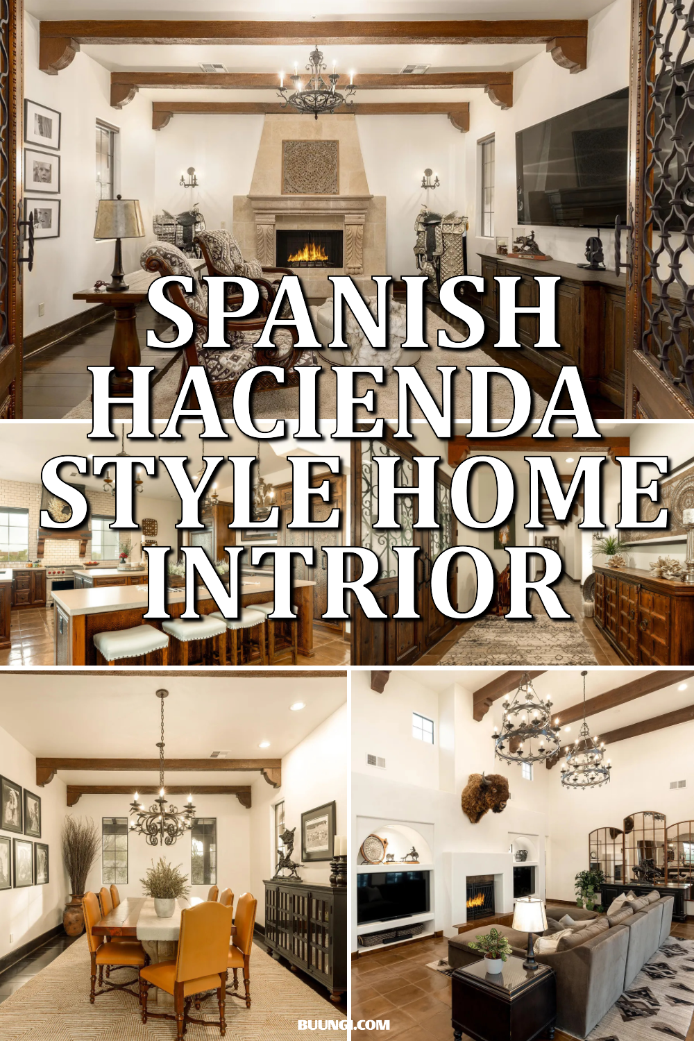 Below, large wrought-iron chandeliers create balance and fill the room with soft light. Their bold shapes echo the Spanish style and add a sense of drama without feeling heavy.
