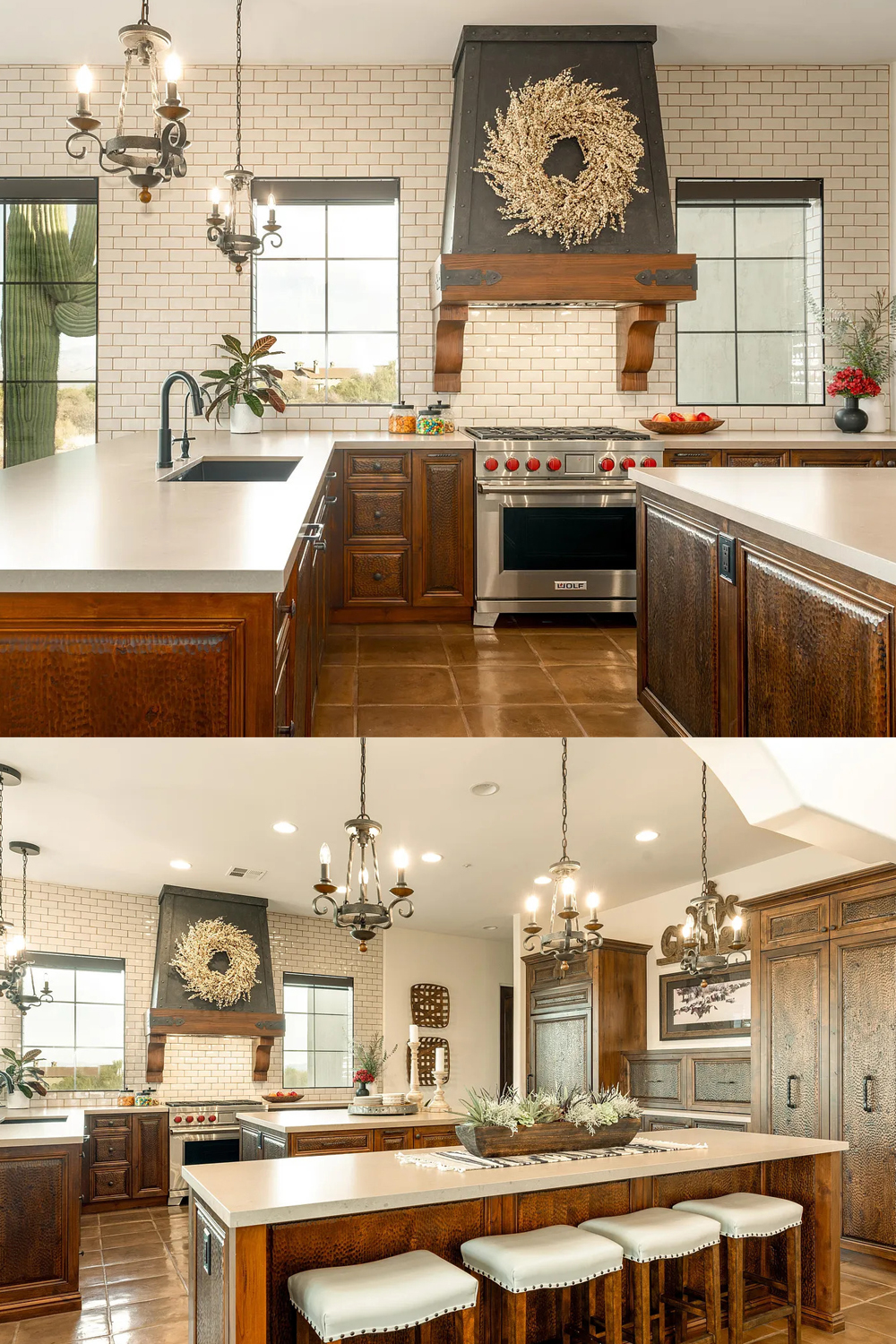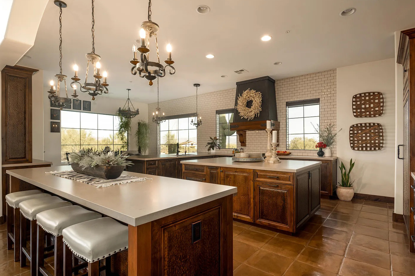 Large islands sit at the center, so family and friends can gather with ease. Soft bar stools line the counter and make the island feel like a casual hangout spot. The room also shines with beautiful iron chandeliers. Their curves bring in a classic Spanish look, while the candles add soft, glowing light.