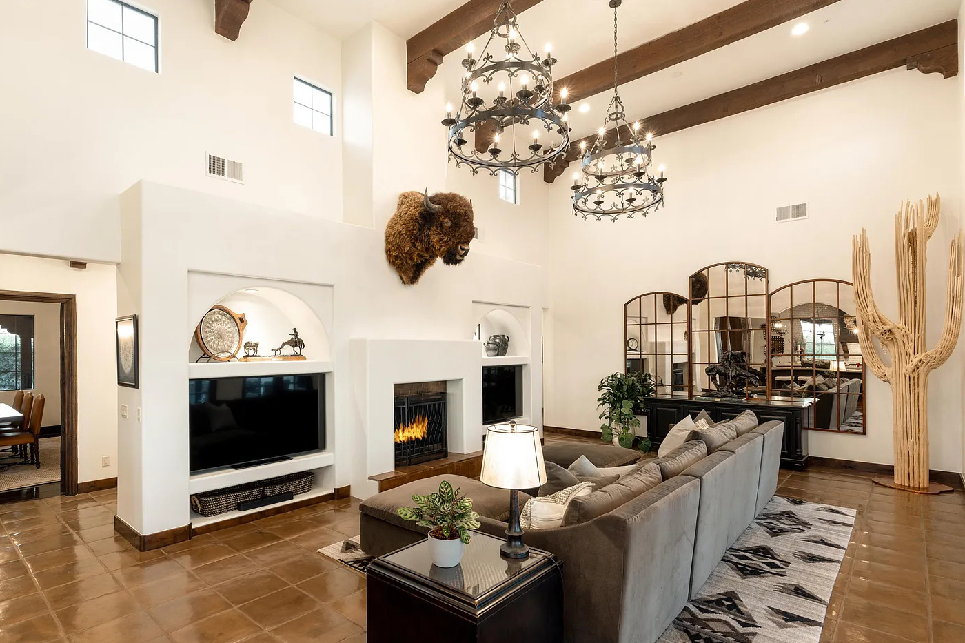 A cozy fireplace sits in the middle of the room. Its clean, arched lines deliver a calm and simple look. Built-in niches surround the fireplace and hold pottery, sculptures, and a few special pieces that tell the home’s story. A bison mount adds a bold Western touch and reminds you of the home’s desert roots.
