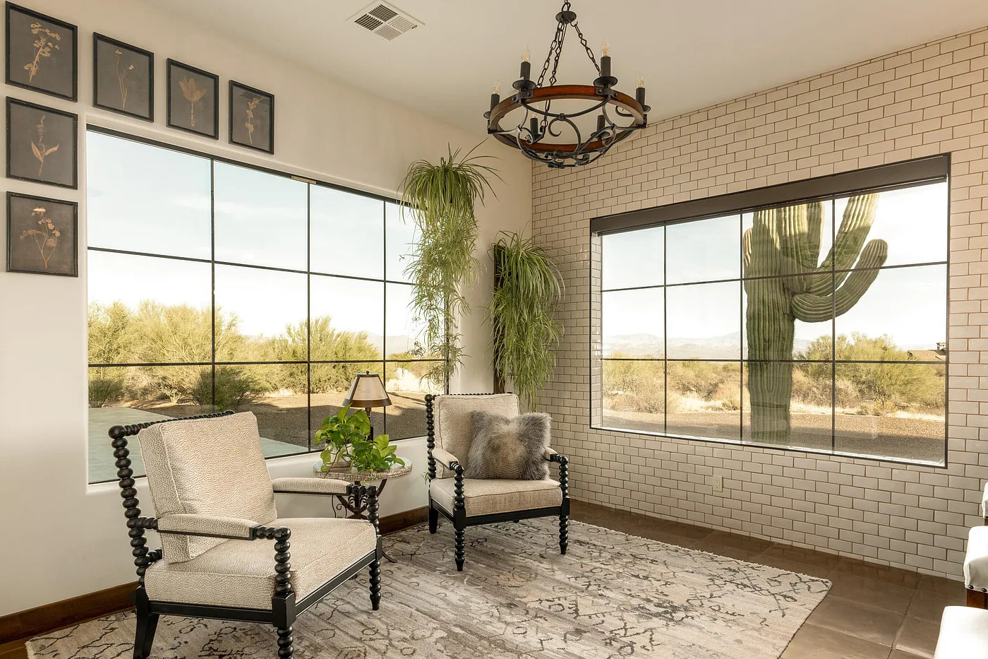 This sunroom feels bright and calm. Huge windows wrap around the space and show off the desert outside. The tall cactus feels almost like part of the room thanks to the clear view.