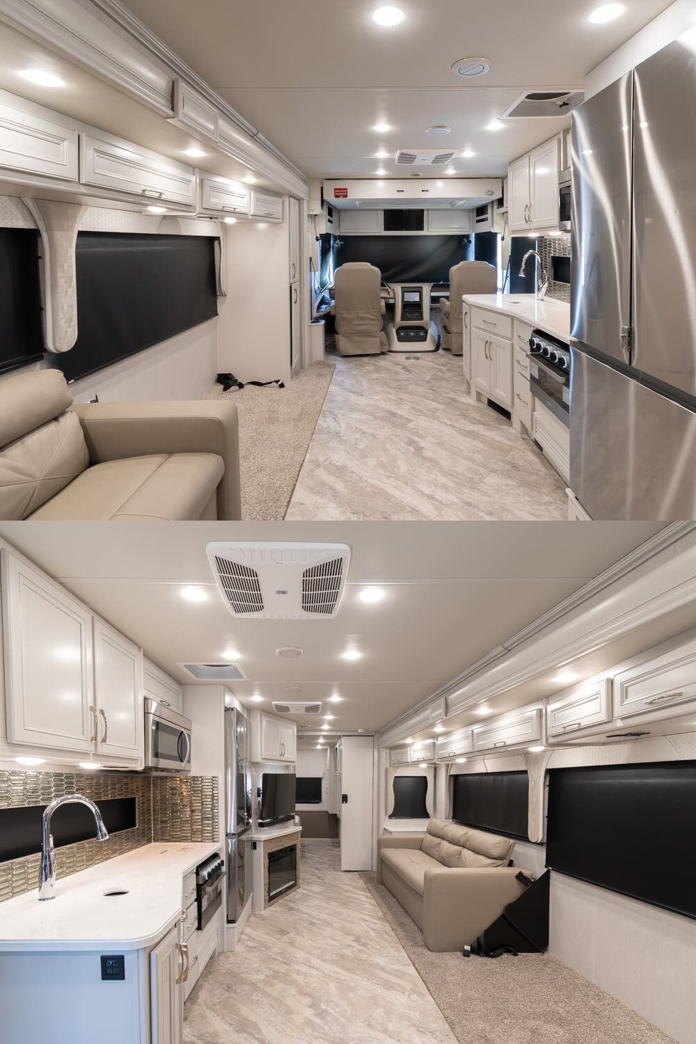 What sets this motorhome apart is how it turns travel into true comfort. You’re not giving up anything for life on the road. The living room feels like a cozy den. The kitchen lets you cook anything you want. The bedroom and bath are bright, modern, and private.