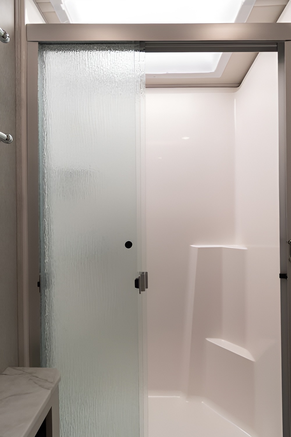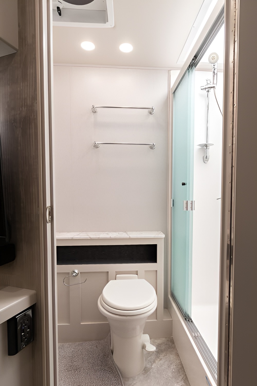 The bathroom in this motorhome is more spacious than you might expect. Step into the shower, and you’ll find glass doors and a handheld sprayer. There’s room to move, and the built-in shelf is great for shampoo or soap.