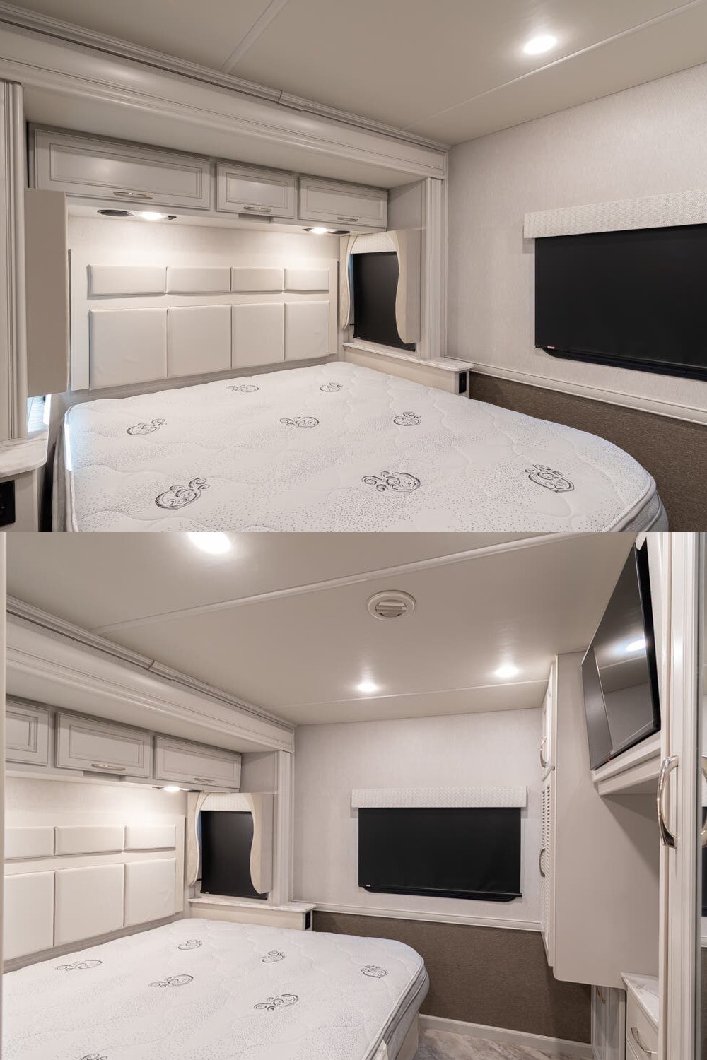 Over the bed, cabinets give you space for clothes and extra sheets. Side closets and drawers make sure nothing ever feels crowded. There’s a TV here, too, so you can relax with your favorite shows before bed.