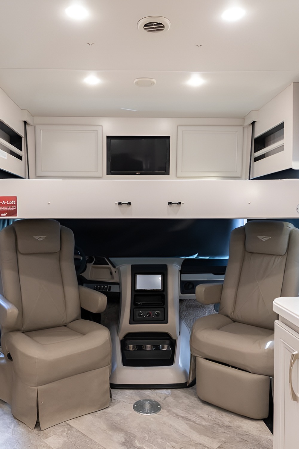 The front of this motorhome is just as nice as the living room. Two big captain’s chairs sit up front, offering support for long drives. The controls are simple and easy to reach, with clear displays. It feels more like a luxury car than an RV.