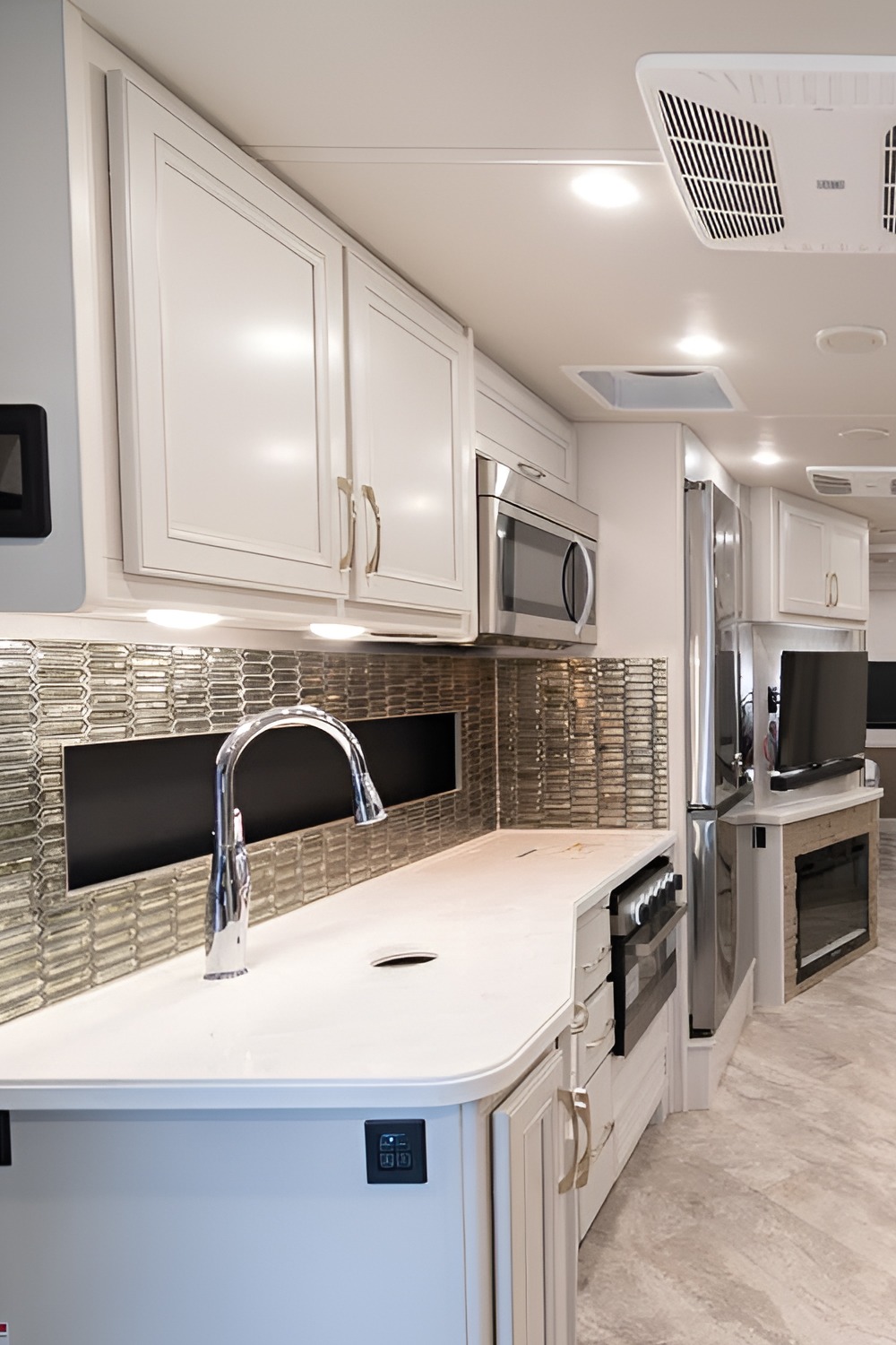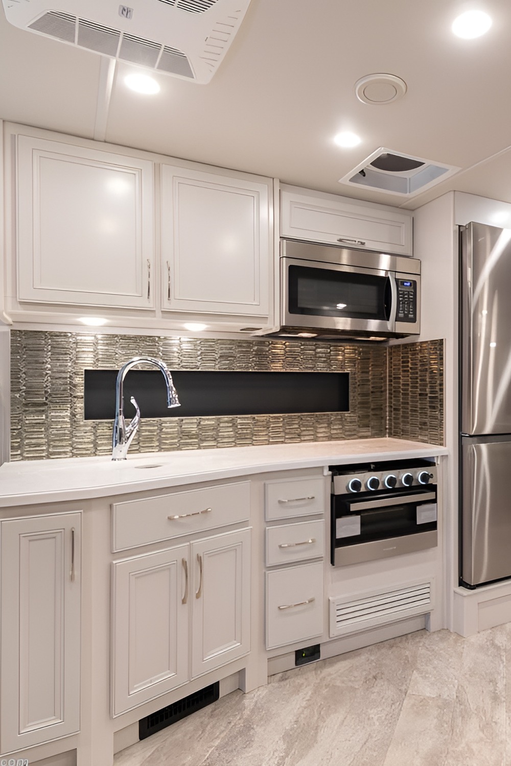 Under the cabinets, you’ll find small lights that make every corner easy to see. The metallic backsplash gives the kitchen a modern twist and bounces light around the room. There’s even a pull-out sprayer at the sink—just like you’d want in a home kitchen.
