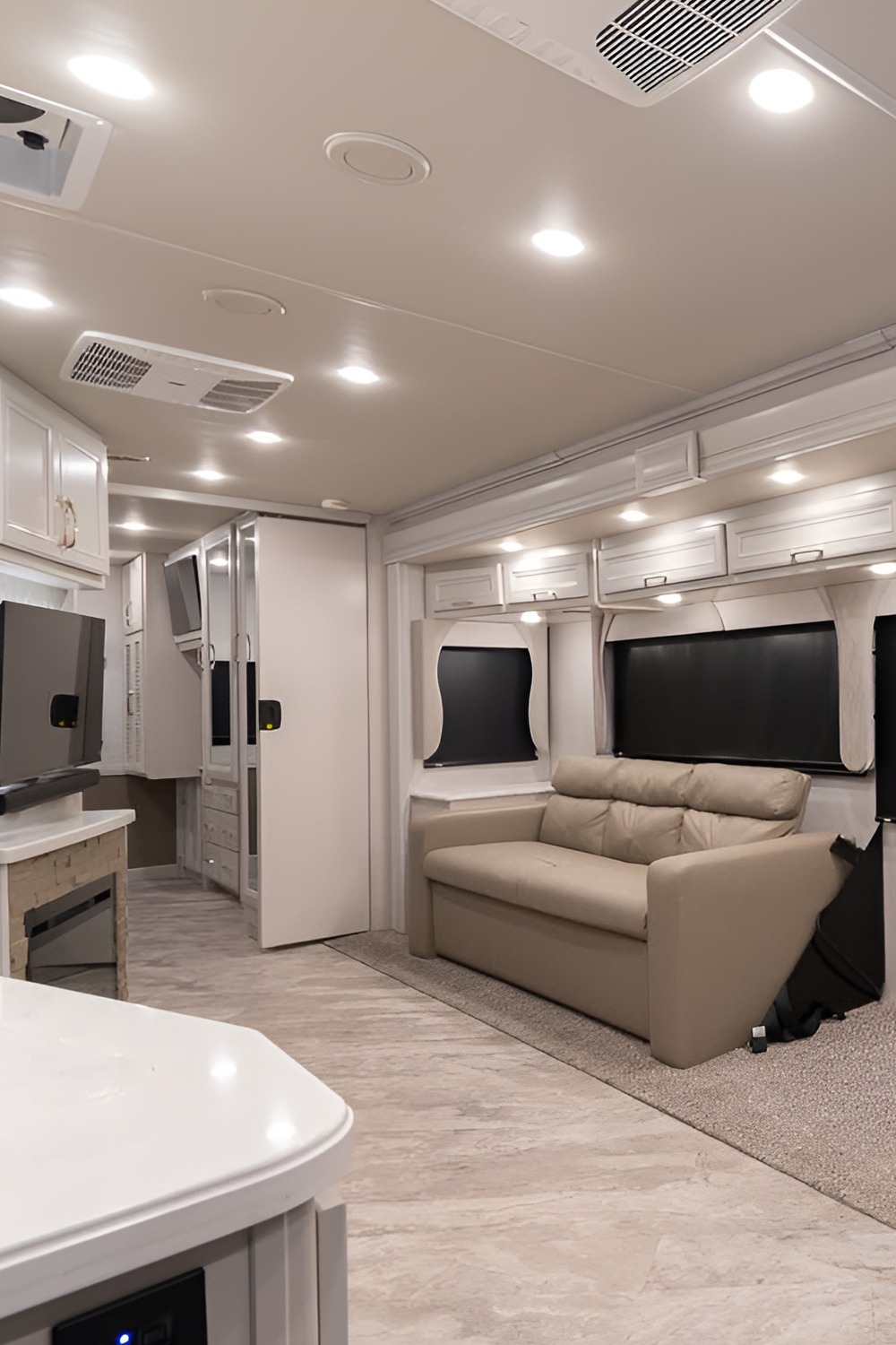 Motorhomes are famous for tight spaces, but this one is different. Storage is everywhere. Cabinets run overhead in the living room and bedroom. The kitchen has deep drawers and shelves for dishes, snacks, and cookware.