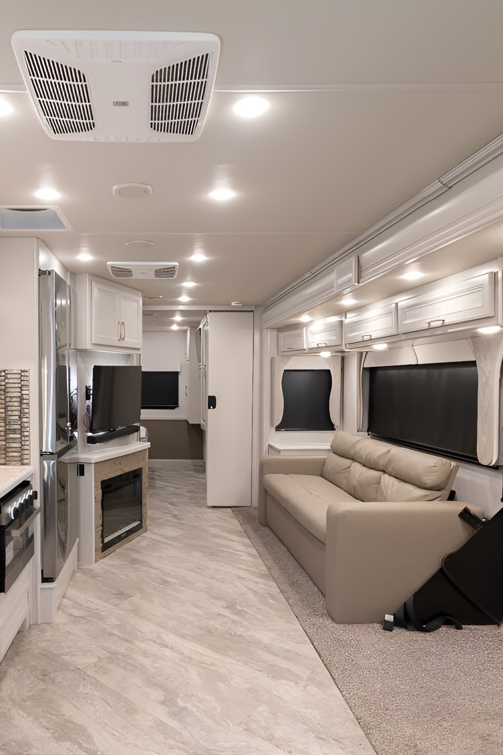 Who says you can’t bring the fun with you? The entertainment center is a star in this motorhome. The big flat-screen TV sits right above an electric fireplace. This fireplace isn’t just for looks—it really warms up the space on cool evenings. The glowing lights and soft crackle set a cozy scene.