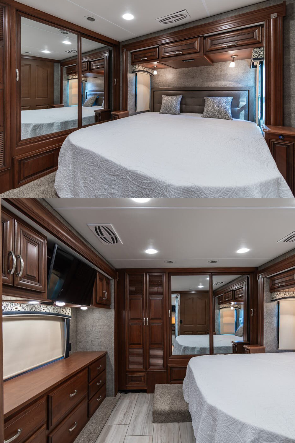 The bedroom is a cozy escape. You get a king bed with a soft headboard. There are nightstands for your books and phone. Overhead cabinets keep extra blankets or clothes tucked away.